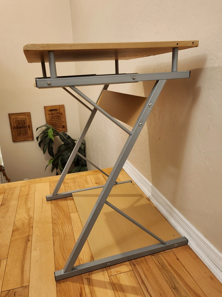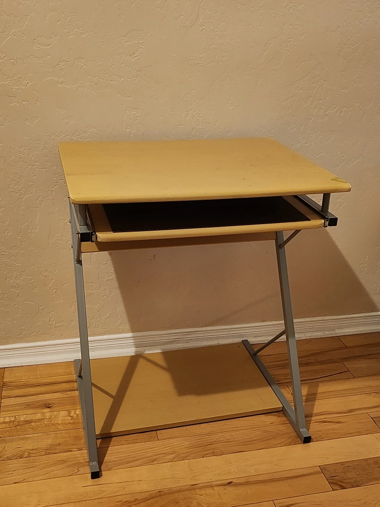 Used mini working desk with roll out drawer (mat included). The desk has a birch wooden surface with metal legs. It is used and has pencil/paint marks but is in good condition.