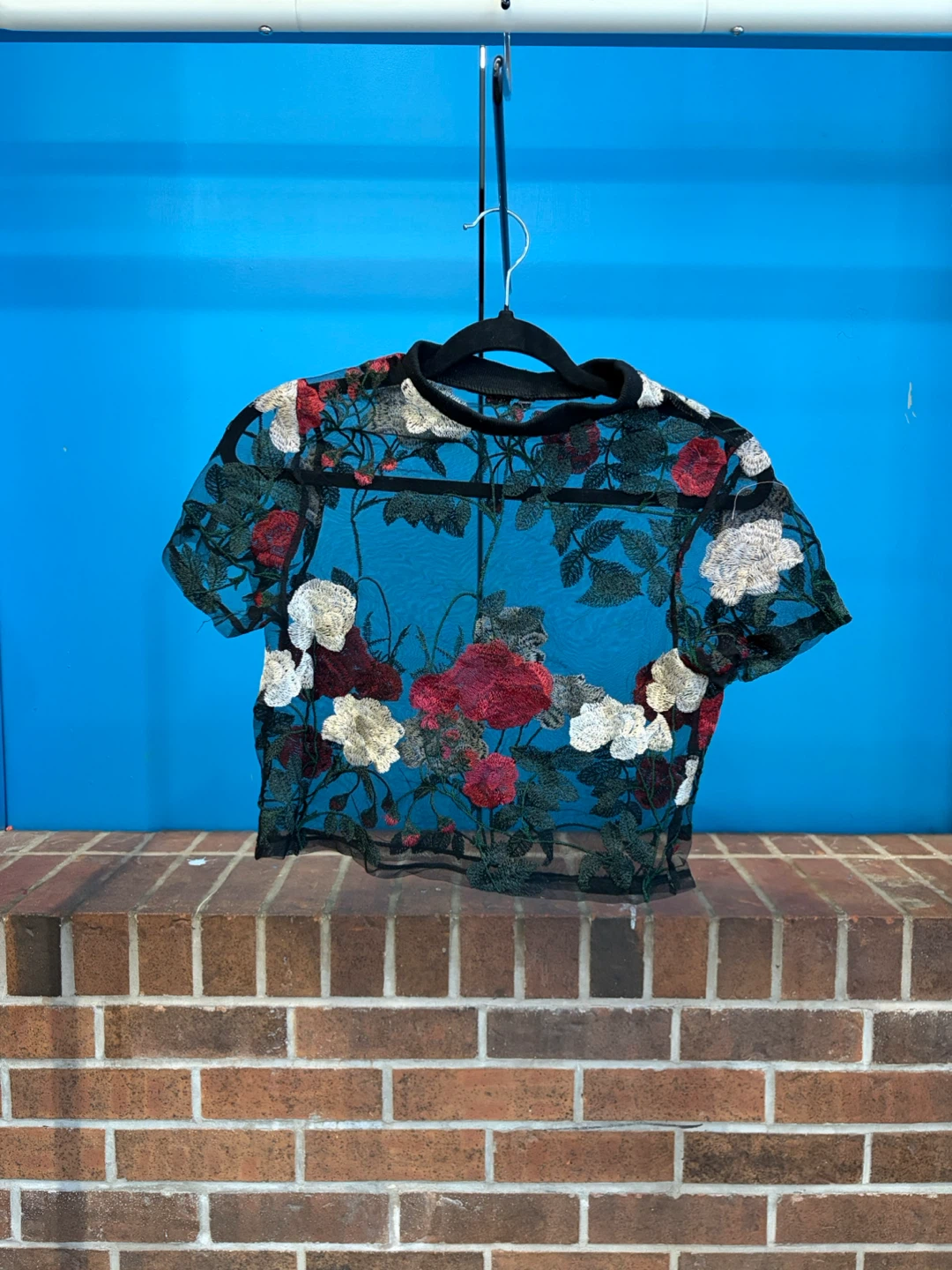 This is a beautiful floral embroidered mesh top. It features red and white flowers on a black mesh background. It's in great condition and perfect for layering or wearing on its own! Likely a size small.
