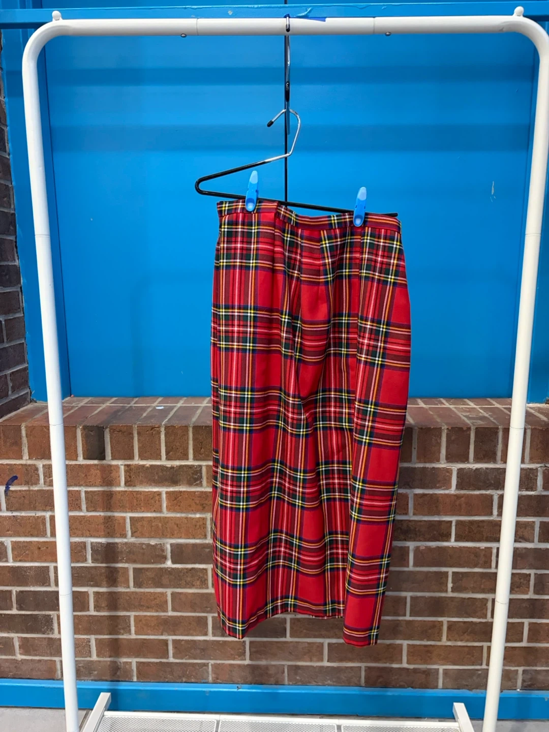 Here's a red plaid skirt that's looking for a new home! It's in great condition and has a classic pattern that's perfect for any occasion. The skirt is a vibrant red with a traditional plaid design, making it a stylish and versatile addition to your wardrobe.