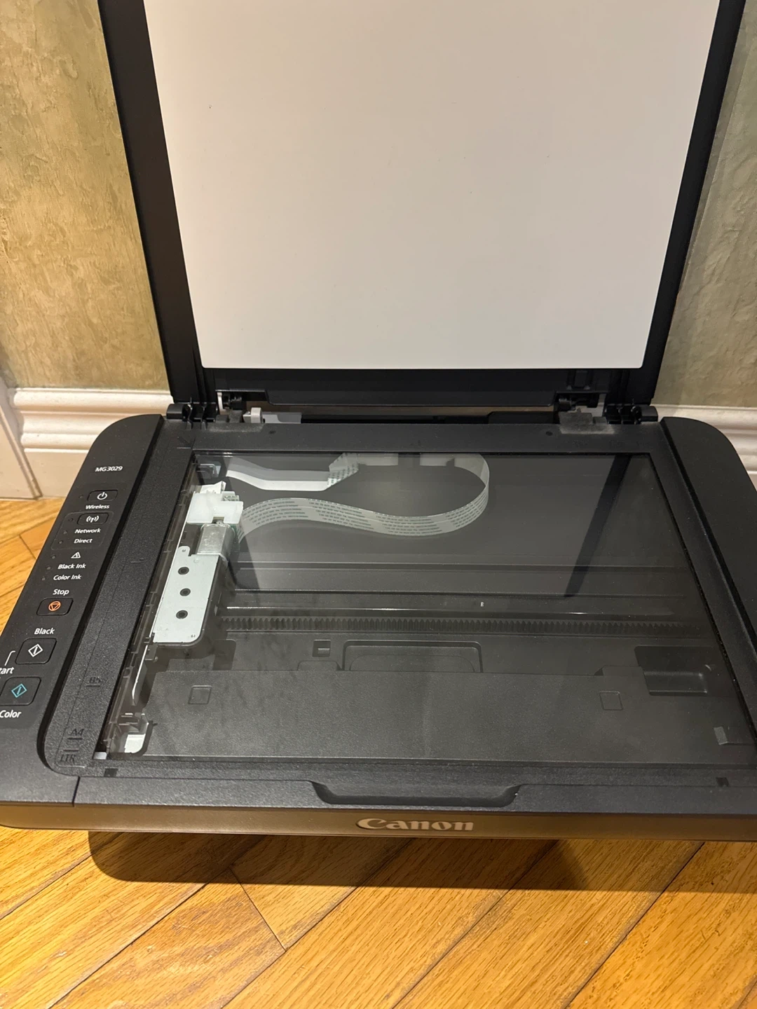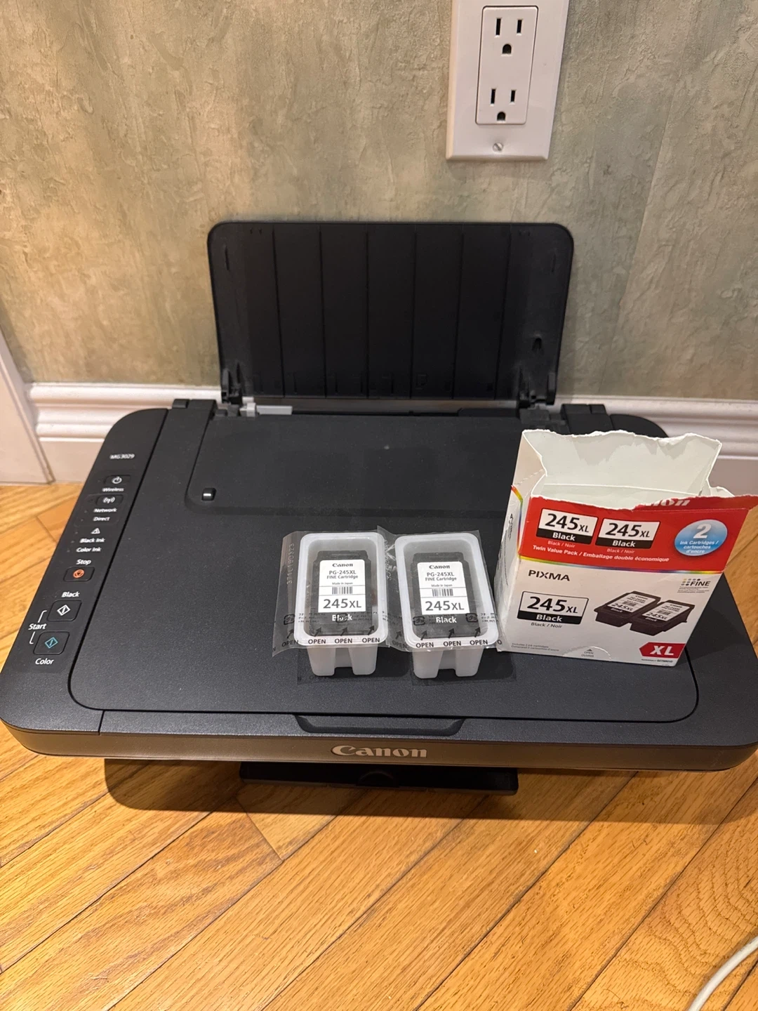 Selling a Canon MG3029 wireless/wired printer + scanner in good condition. It comes with some color and black ink preinstalled. Does NOT come with the two inks in the picture.