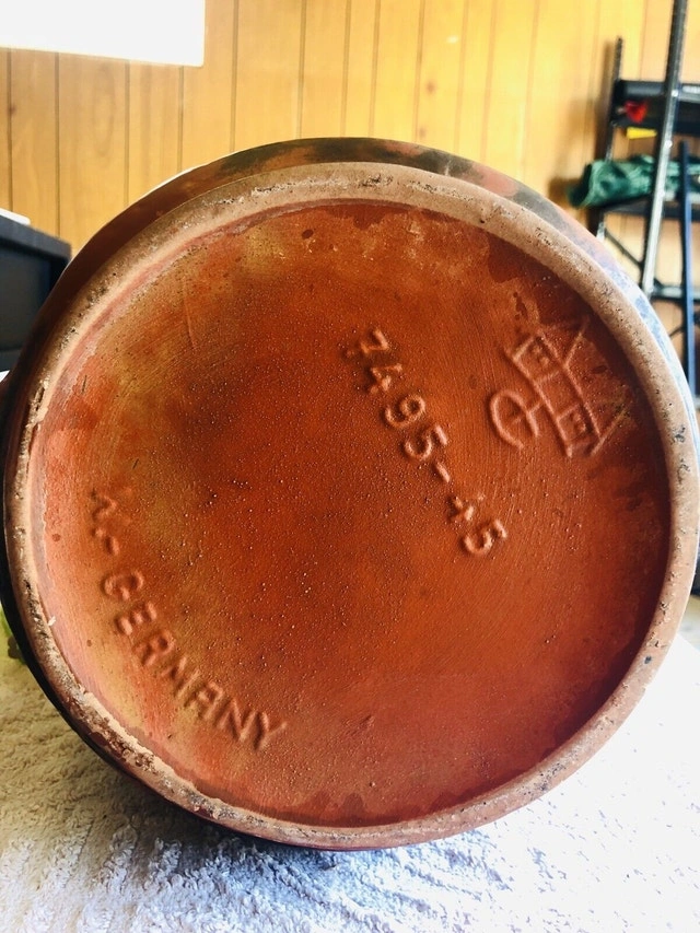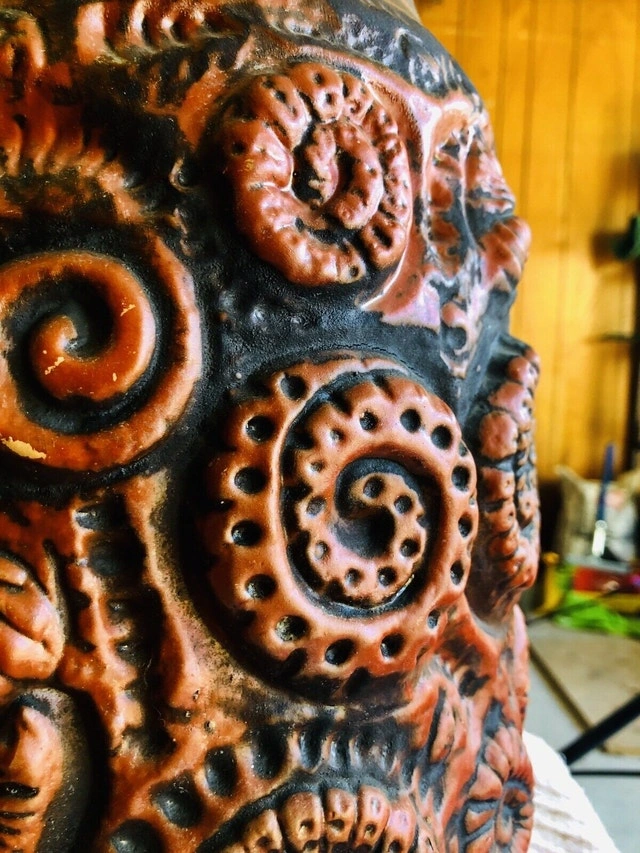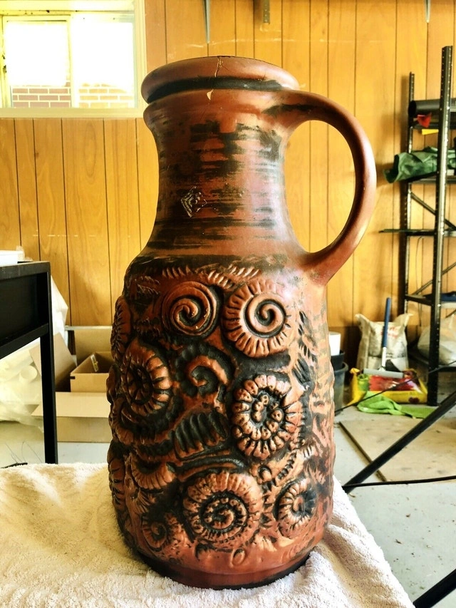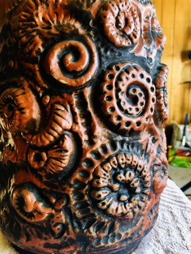 Stunning vintage West Germany floor vase made by Carstens Tönnieshof. Grand, bold and beautiful. Decorated with RELIEF floral dynamic motif. Lots of details. Base emboss marking: 7495-45 It stands 45cm (17-18”) tall. Please see the pictures carefully. There is a crack repair on the top rim area. Other than that, it’s all good. Price reflects this unfortunateness.