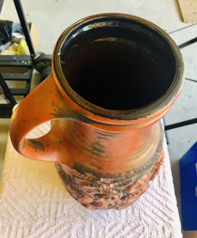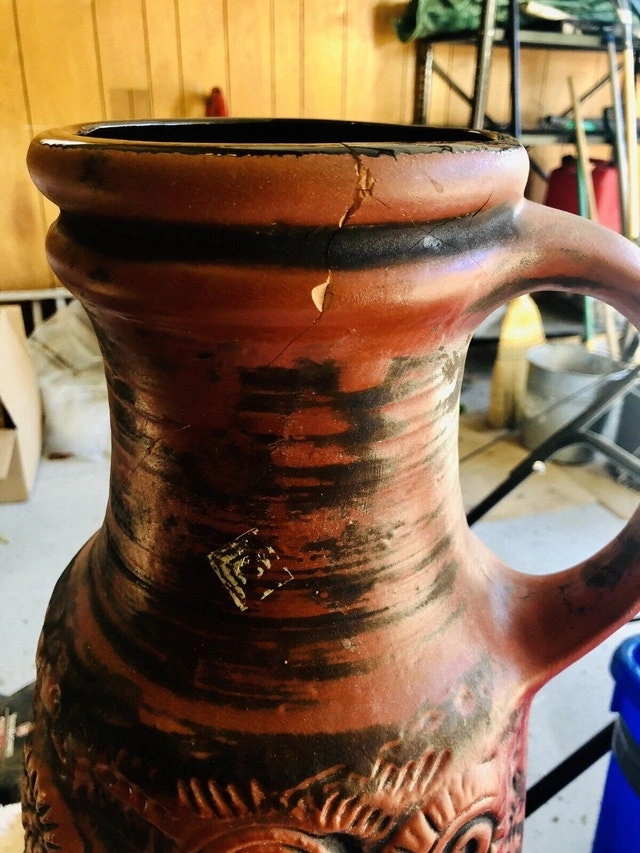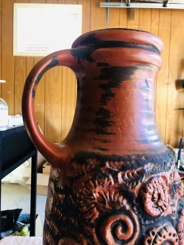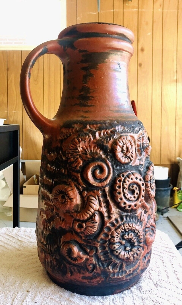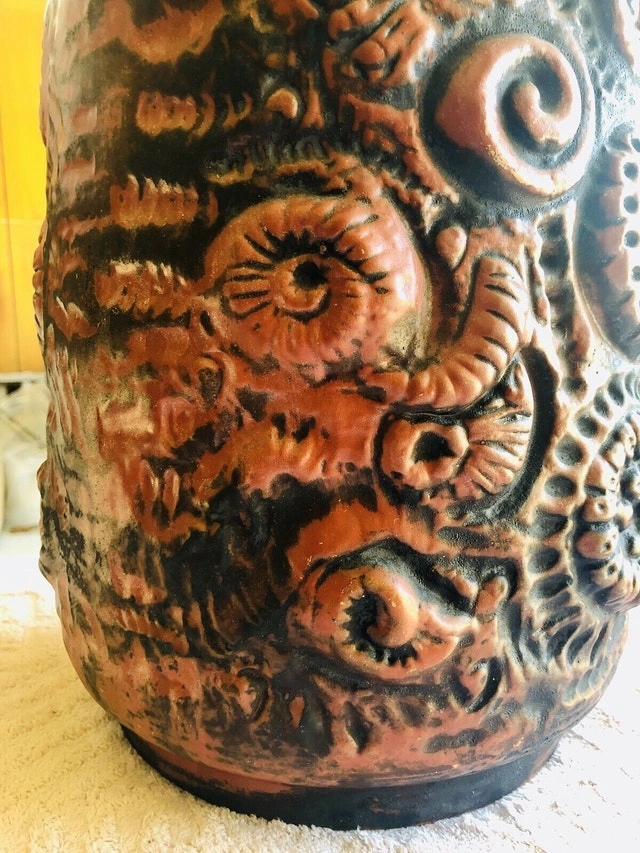 Stunning vintage West Germany floor vase made by Carstens Tönnieshof. Grand, bold and beautiful. Decorated with RELIEF floral dynamic motif. Lots of details. Base emboss marking: 7495-45 It stands 45cm (17-18”) tall. Please see the pictures carefully. There is a crack repair on the top rim area. Other than that, it’s all good. Price reflects this unfortunateness.