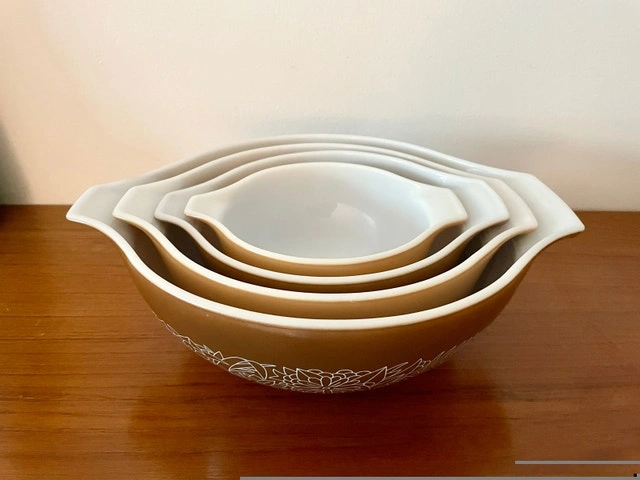 Vintage Pyrex Woodland Cinderella Bowls Set (444, 443, 442, 441). A full completed set in excellent condition. Pattern: Woodland (1978-1983). Pickup only.