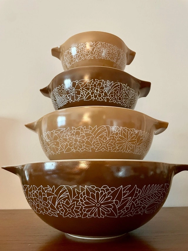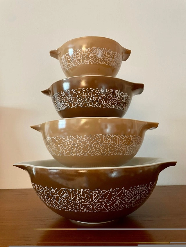 Vintage Pyrex Woodland Cinderella Bowls Set (444, 443, 442, 441). A full completed set in excellent condition. Pattern: Woodland (1978-1983). Pickup only.