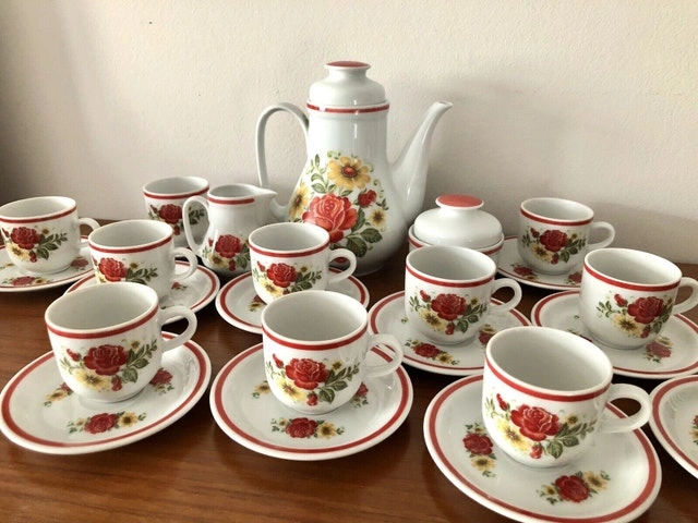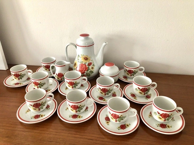 This set includes: 1 X Tea Pot, 1 X Sugar Jar, 1 X Creamer, 11 X Tea Cups, 12 X Tea Cup Saucers. Excellent condition. No chips or damages. Price is firm.