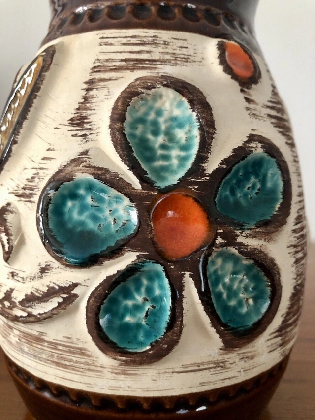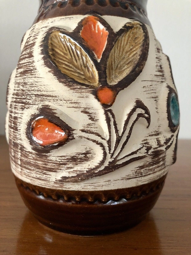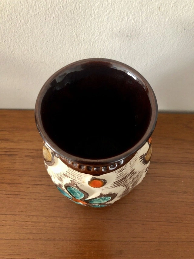 A special vase from Bay/Ransbach in the Westerwald (1933-1998) from the late 60s. It has a floral design, the flowers are applied in relief technique. There is a tiny chip at the rim (see the last pic). Other than that, it’s all perfect! It stands 17cm tall!
