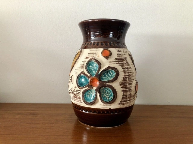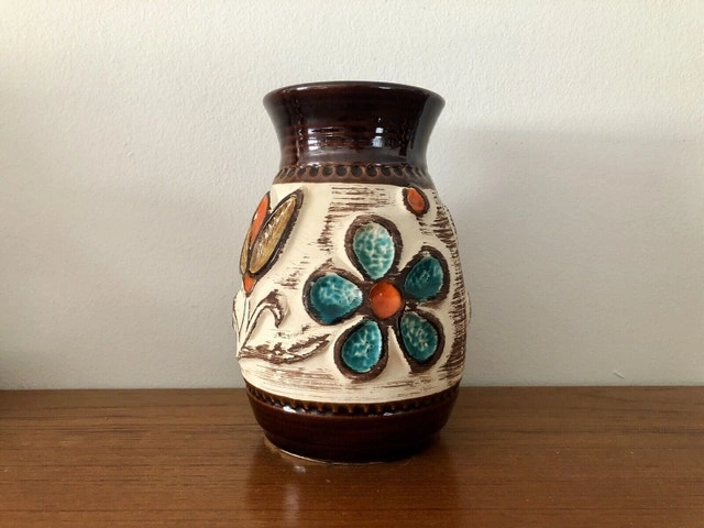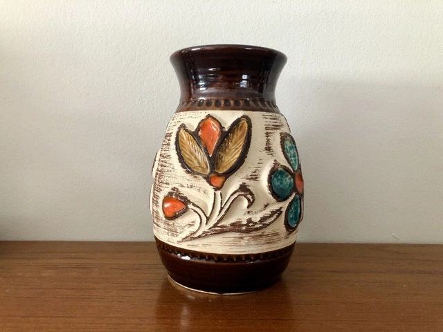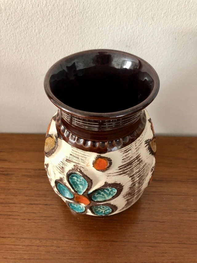 A special vase from Bay/Ransbach in the Westerwald (1933-1998) from the late 60s. It has a floral design, the flowers are applied in relief technique. There is a tiny chip at the rim (see the last pic). Other than that, it’s all perfect! It stands 17cm tall!