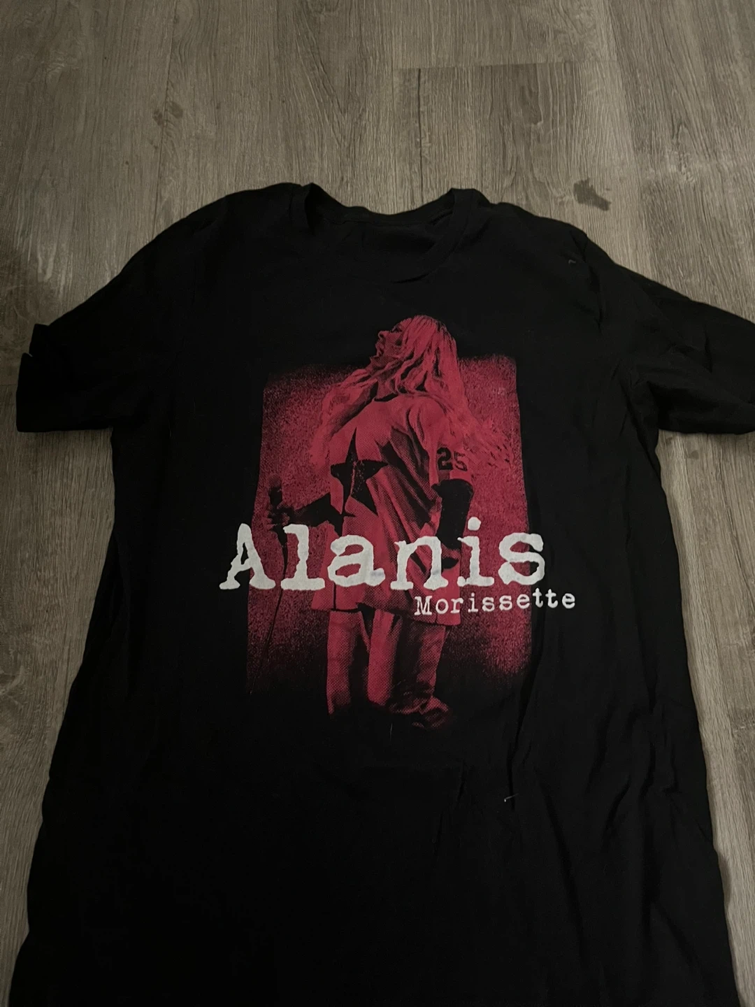 Selling an Alanis Morissette t-shirt from the 2022 North American tour! It's black and features tour dates on the back and a graphic of Alanis on the front.