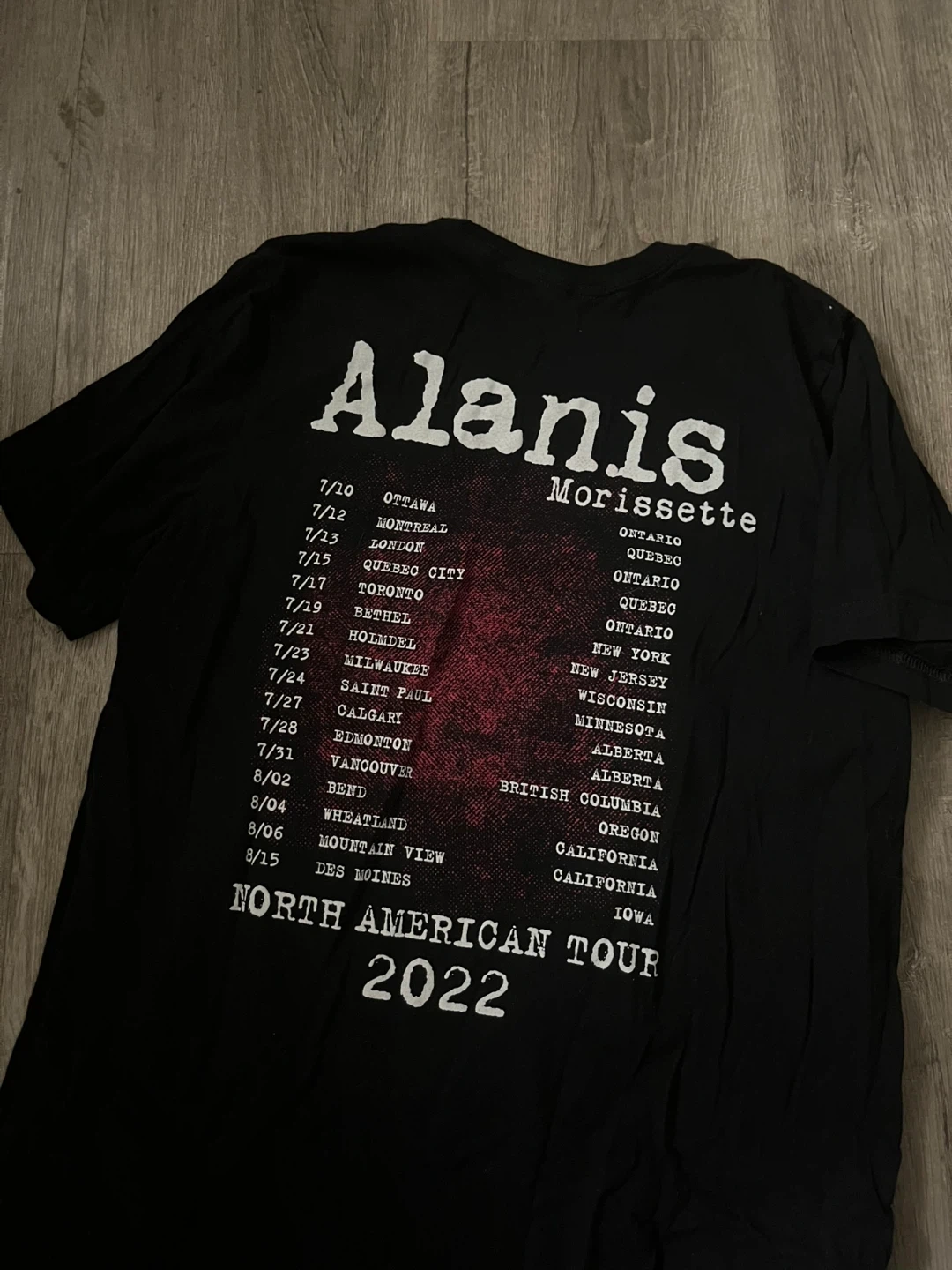 Selling an Alanis Morissette t-shirt from the 2022 North American tour! It's black and features tour dates on the back and a graphic of Alanis on the front.
