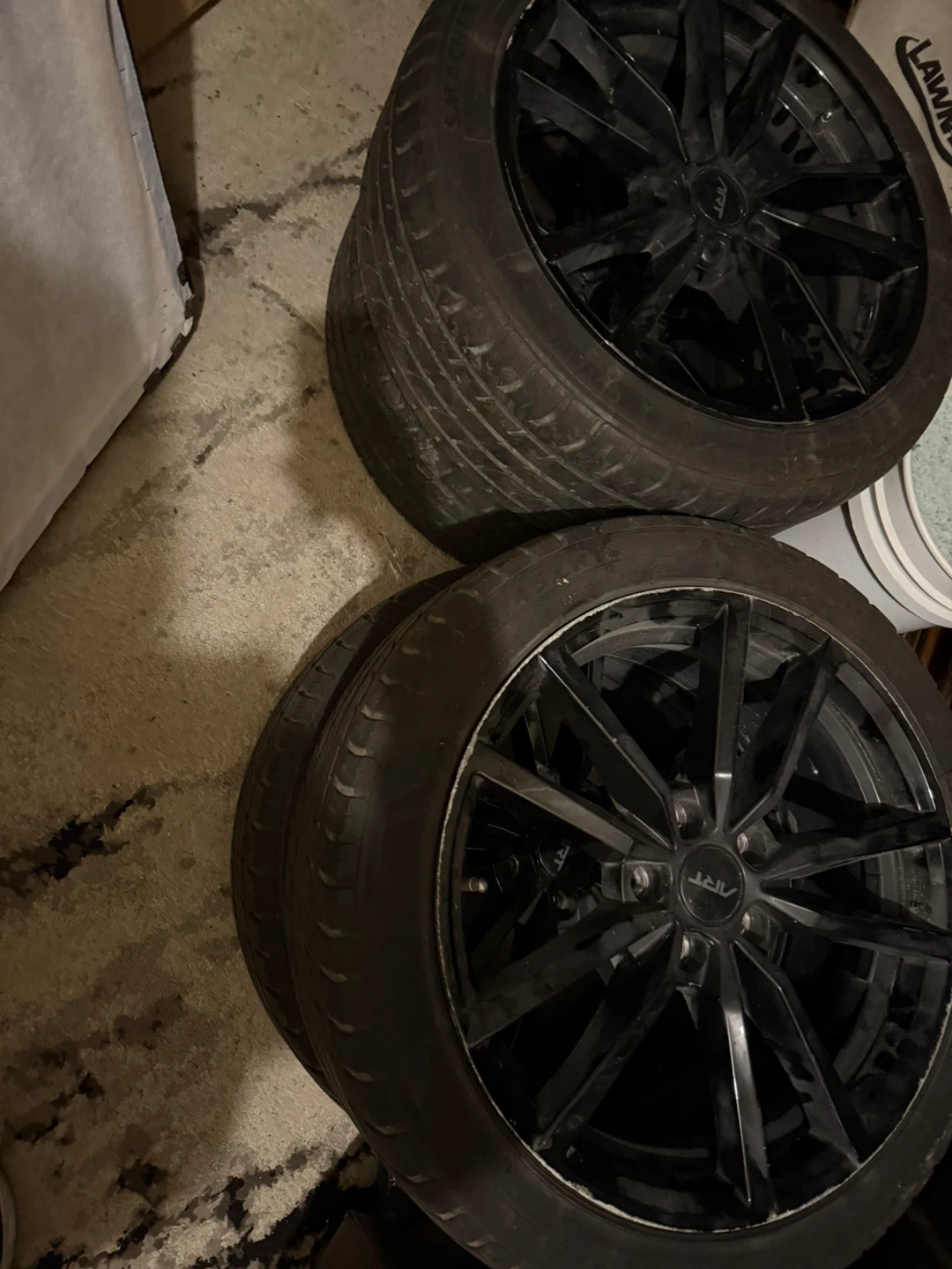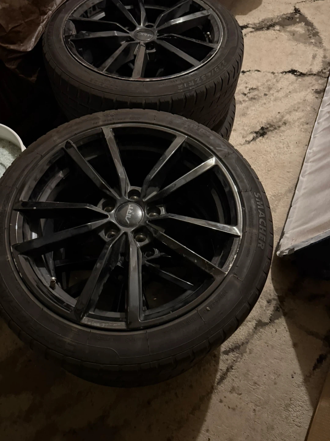 Selling a set of four APT wheels with tires. They're black and in used condition. The tires are labeled SMACHER. 225/45Rz/18