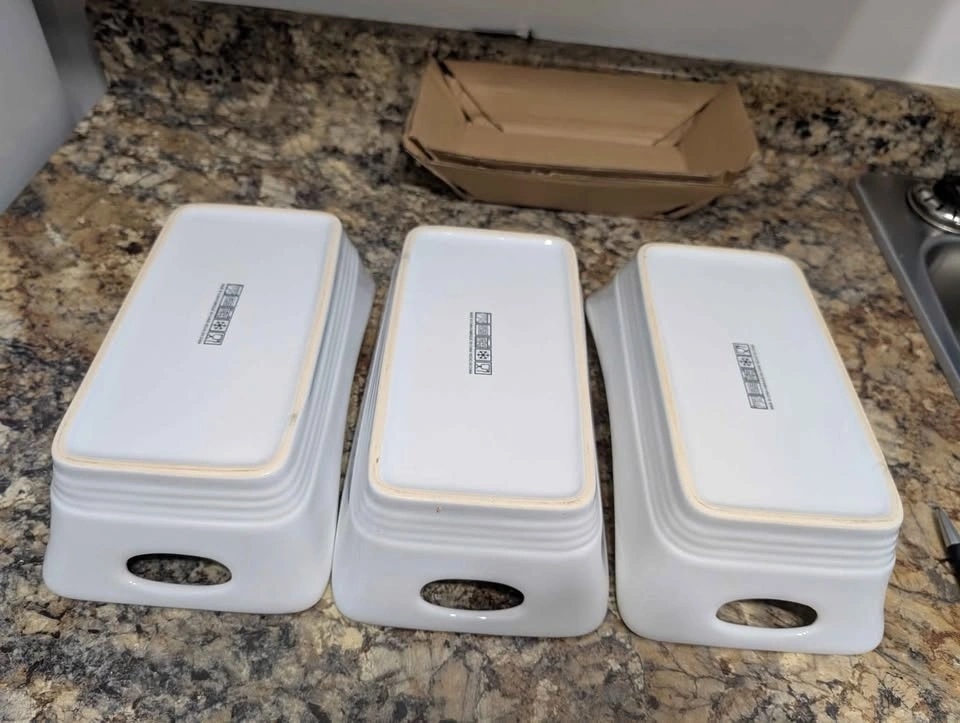 Selling a set of three serving dishes. These will be perfect for Christmas dinner. In like new condition, no chips no scratches and no stains. Used twice. They are microwave, oven, freezer and dishwasher safe. Each dish is 6 cm (2.25 inches) deep in the center. Bottom is 12 x 22 cm (4.75 x 8.75 inches). Top is 15 X 28 cm ( 6 x 11 inches).