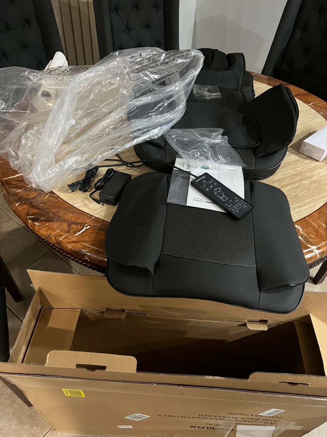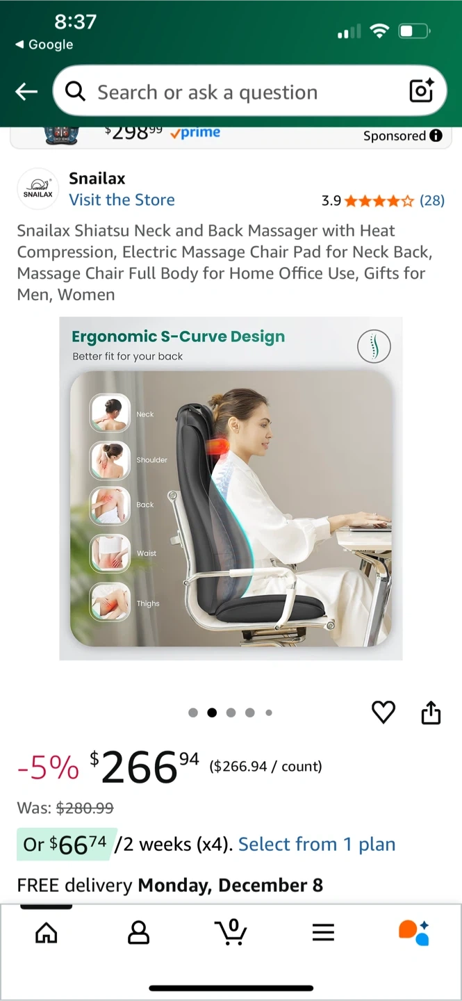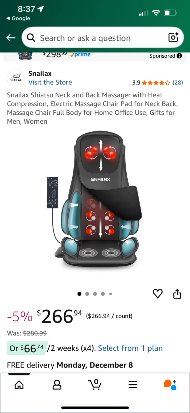 Selling a Snailax Shiatsu Neck and Back Massager with Heat Compression! It's in great condition and includes the remote and power adapter. Originally bought for $298.99. This massager features an ergonomic S-Curve design for better back support, targeting the neck, shoulders, back, waist, and thighs.