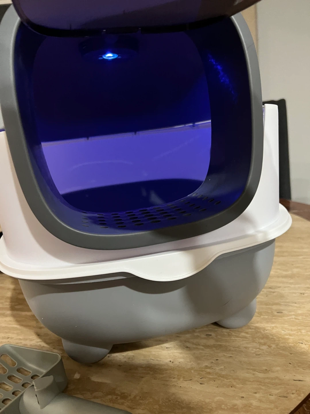 Selling a GROWTH TANK hooded cat litter box in grey. It features a front door flap and a durable removable potty. Comes with a kitty litter tray and a scoop for easy cleaning!