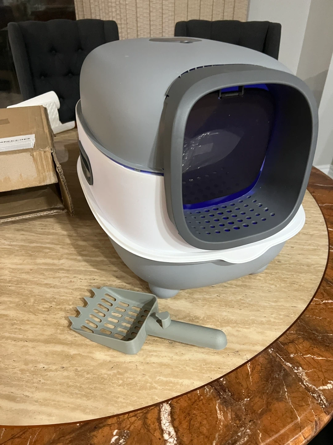 Selling a GROWTH TANK hooded cat litter box in grey. It features a front door flap and a durable removable potty. Comes with a kitty litter tray and a scoop for easy cleaning!