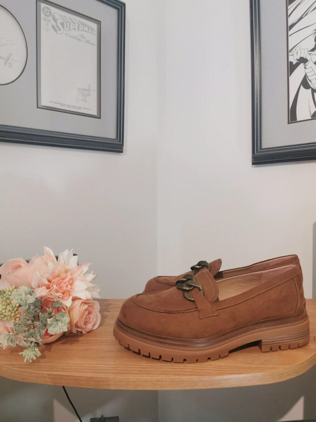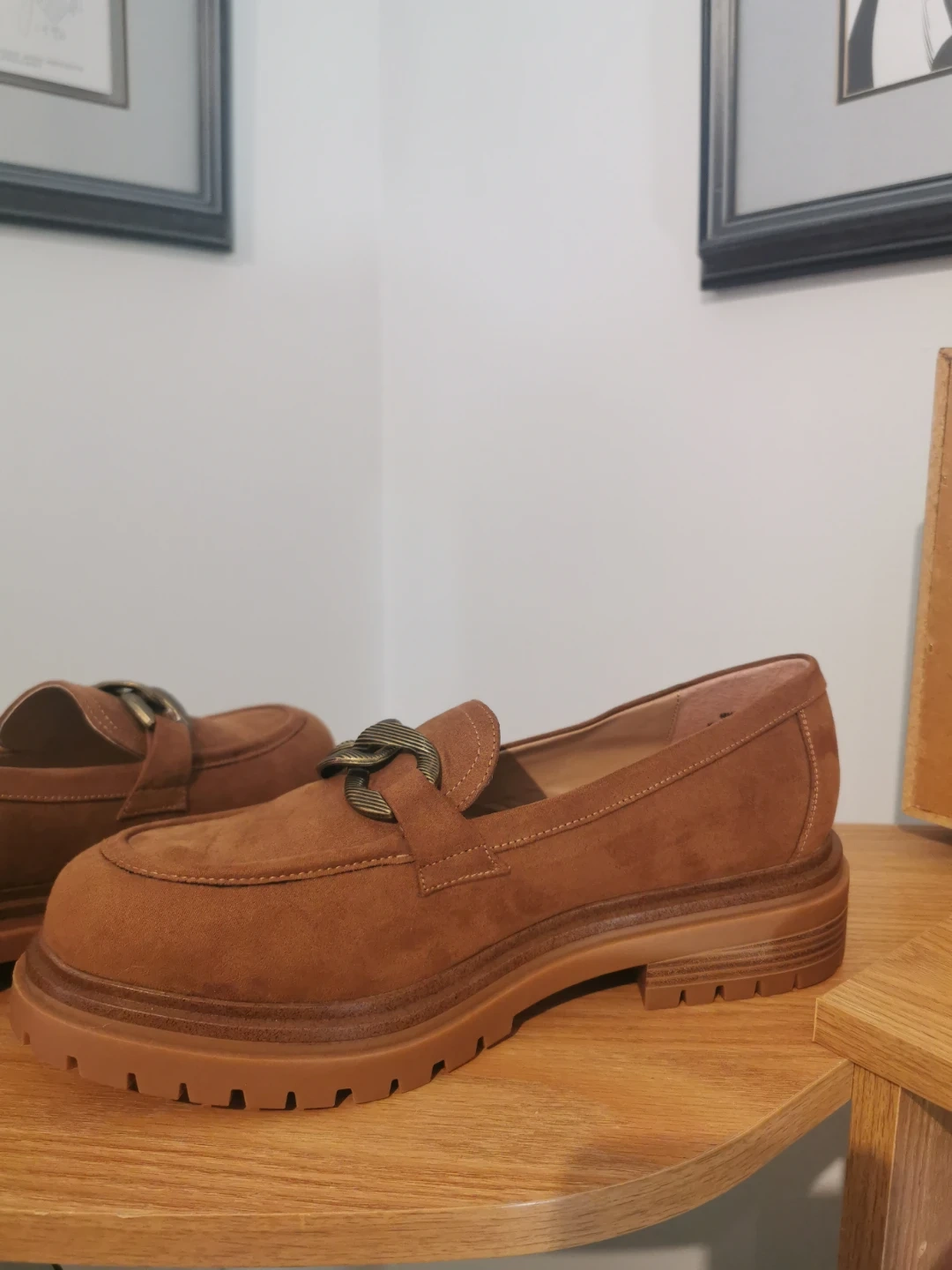 Selling a pair of brown suede loafers! They are in great condition and would be perfect for everyday wear. The shoes are a lovely brown colour and feature a chain detail on the front. These loafers have