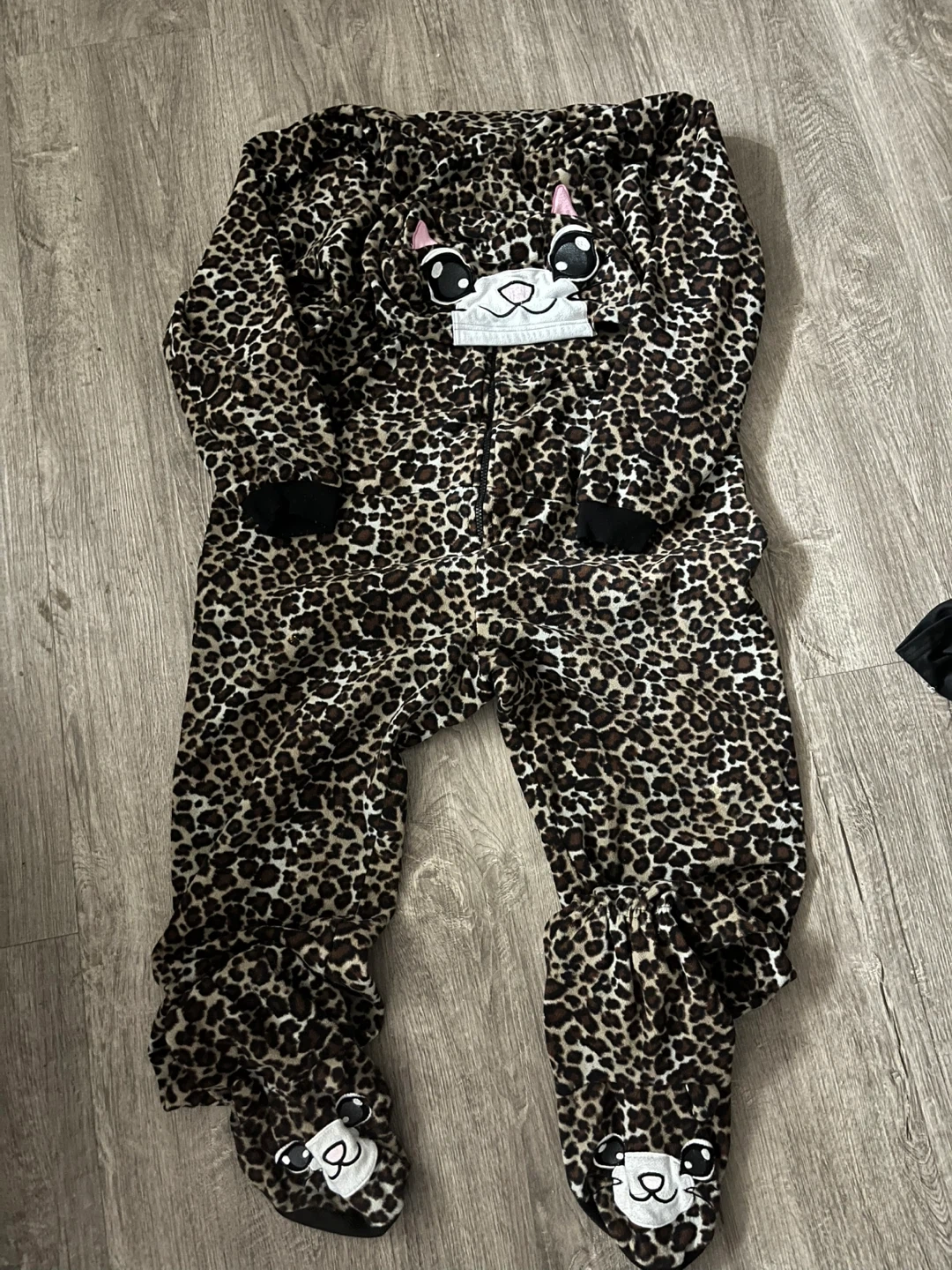 super cute leopard print onesie! It has a hood with a cute animal face on it and little animal faces on the feet too. It's perfect for lounging around the house on a chilly day! size XL