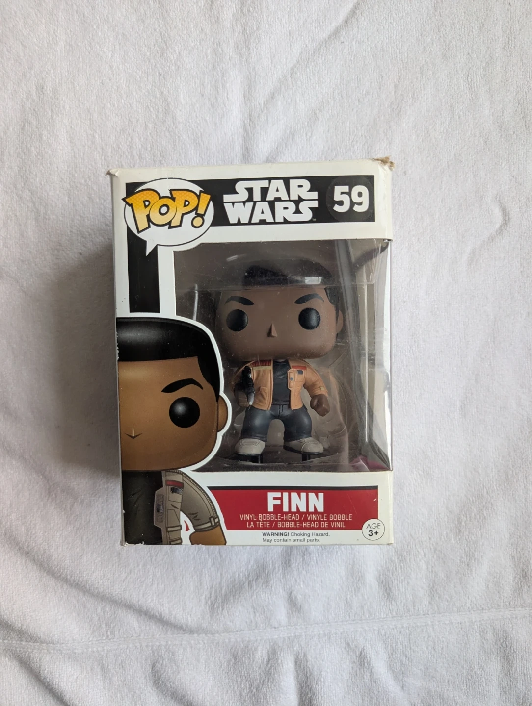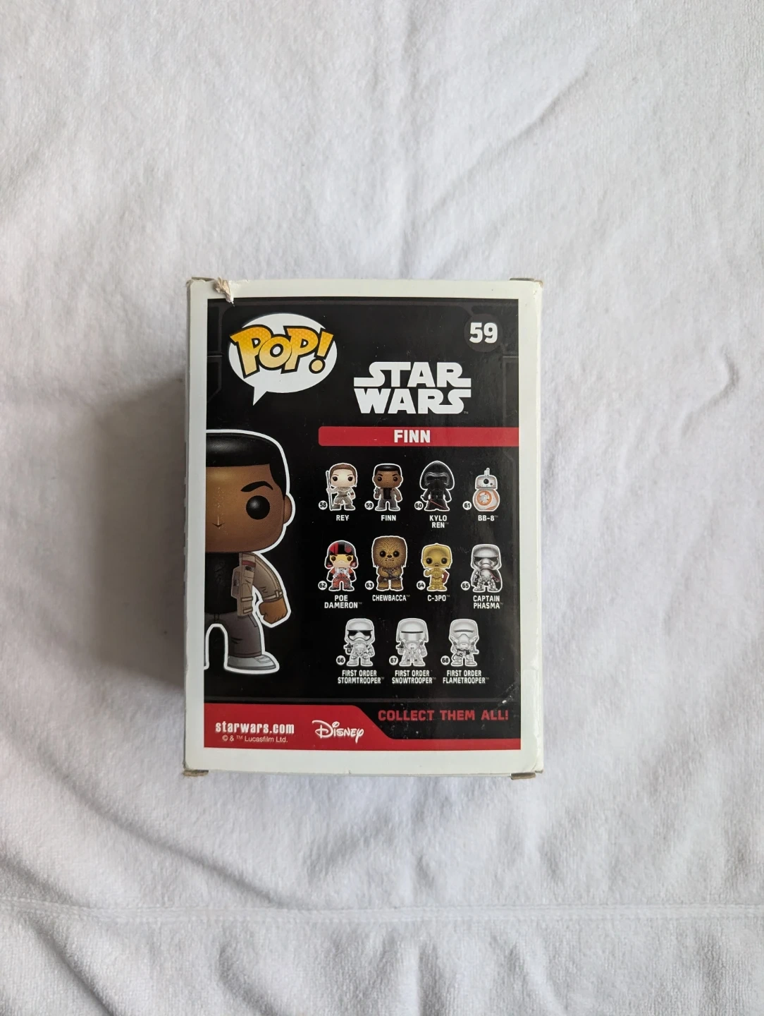 Add a touch of the Force to your collection with this brand new in box Funko Pop! Star Wars #59 figure of Finn, complete with its original box. A fantastic addition for any Star Wars enthusiast or Funko collector! Box has some damage.
