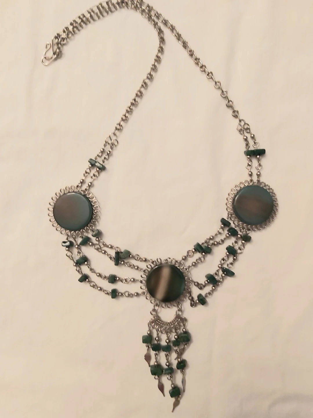 Selling a lovely necklace with green stones and silver-tone metal. It's in great condition and would be a beautiful addition to any outfit!