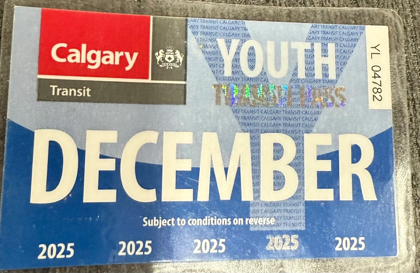 Selling a Calgary Transit youth pass, valid for December 2025. It's subject to conditions on the reverse. Perfect for getting around Calgary!
