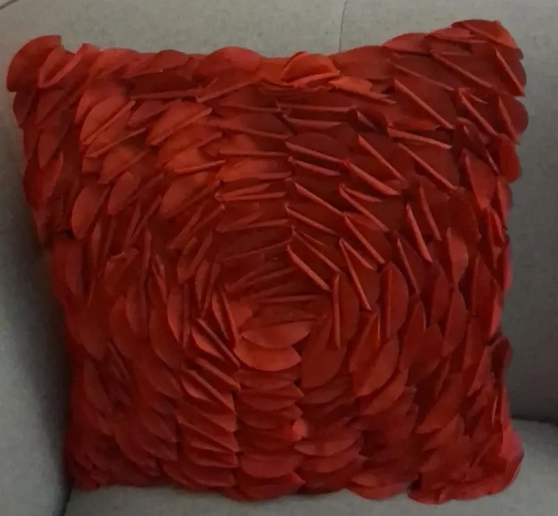Pair of 2. Here's a decorative throw pillow in a vibrant red colour. It has a unique design with petal-like accents. Perfect for adding a pop of colour and texture to your living space!