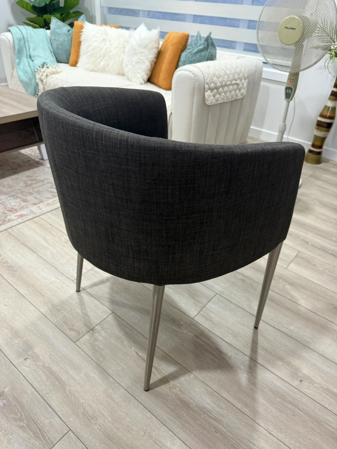 Selling a stylish grey accent chair! It's in great condition and would look lovely in any living space or bedroom. The chair features a curved back and sleek metal legs. It's comfortable and sturdy, perfect for adding a touch of modern elegance to your home