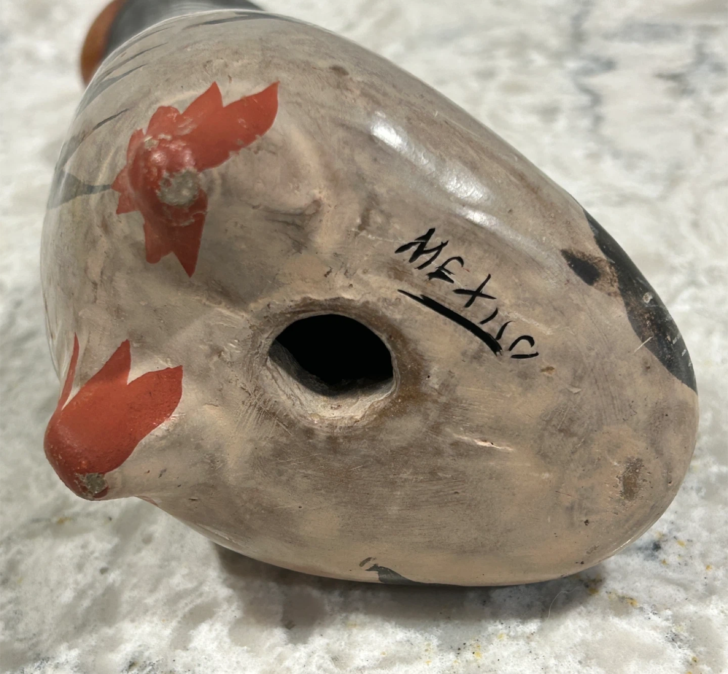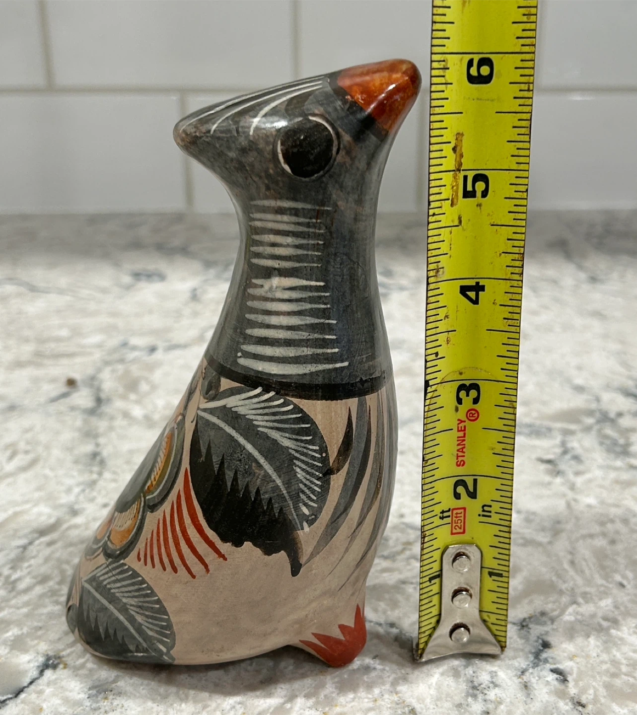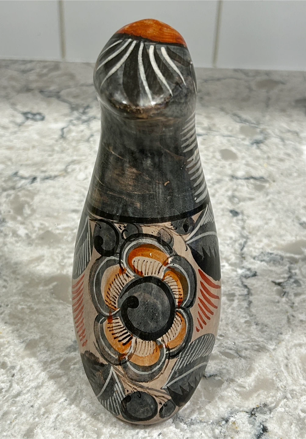 Approx 6 inches tall and features intricate designs in black, orange, and grey.