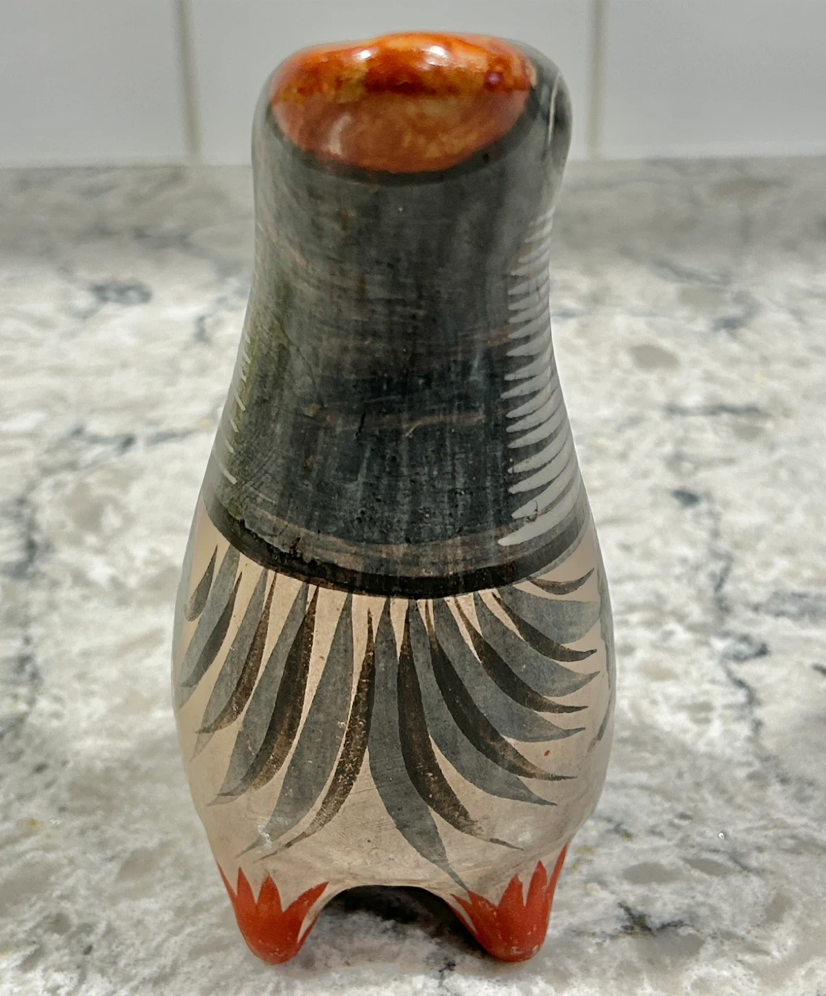 Approx 6 inches tall and features intricate designs in black, orange, and grey.