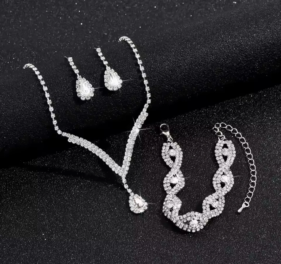 Sparkle and shine with this lovely rhinestone jewellery set! It includes a necklace, bracelet, and earrings, all adorned with shimmering rhinestones. Perfect for adding a touch of elegance to any outfit!