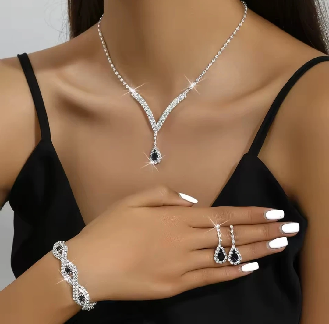 Sparkle and shine with this lovely rhinestone jewellery set! It includes a necklace, bracelet, and earrings, all adorned with shimmering rhinestones. Perfect for adding a touch of elegance to any outfit!