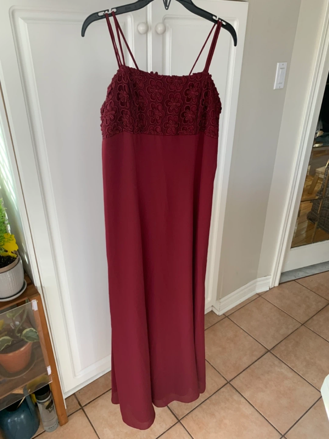 Long ankle-length. Size Small. Burgundy colour dress with matching shawl. Selling for $25 CAD firm. Smoke Free Home.