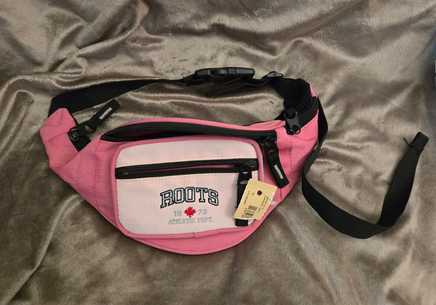 Check out this brand new Roots fanny pack! It's pink with a black strap and still has the tags attached. Perfect for keeping your essentials close by while staying stylish Ready for gift giving! Pick up near Hillcrest Mall or as decided
