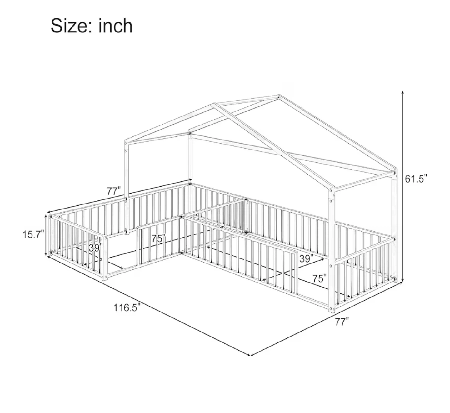 Selling a SOFTSEA Twin Size L-Shaped House Floor Bed in black. It features a metal Montessori bed frame with fence guardrails. Designed as a double twin corner house bed for 2 kids. Easy to assemble and does not include slats. Dimensions are approximately 77" x 116.5" x 61.5".