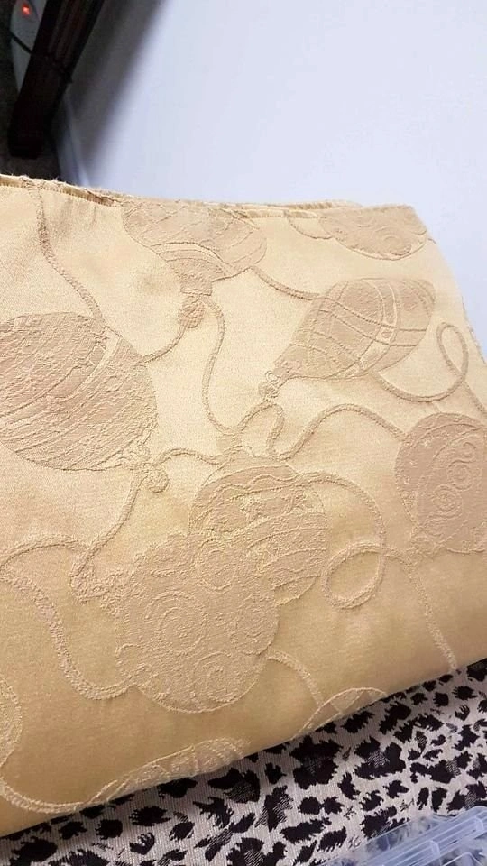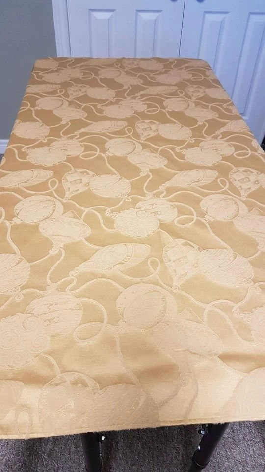 Small custom made Holiday Tablecloth. Antique gold embossed with Xmas Balls. 52" x 56". Fits a 4 ft. Long table without end drop or a card table. Thick Polyester cotton blend. Machine wash and dry. No iron if you take it straight out of the dryer. Smoke/pet free home. Pick up in west end of Peterborough near Glenforest. $5