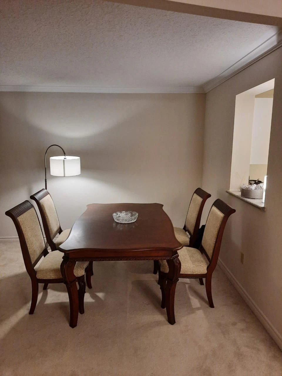 Beautiful solid wood dining table with a rich, brown finish and classic carved legs. Comes with 6 matching upholstered chairs in excellent condition — very comfortable and sturdy.