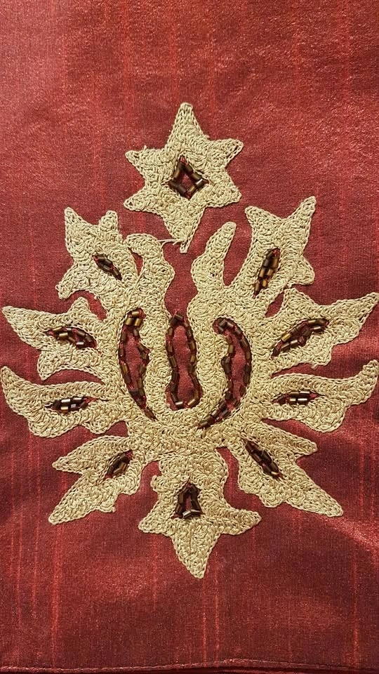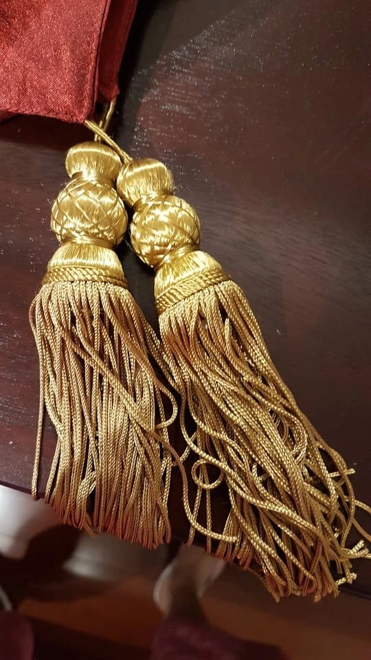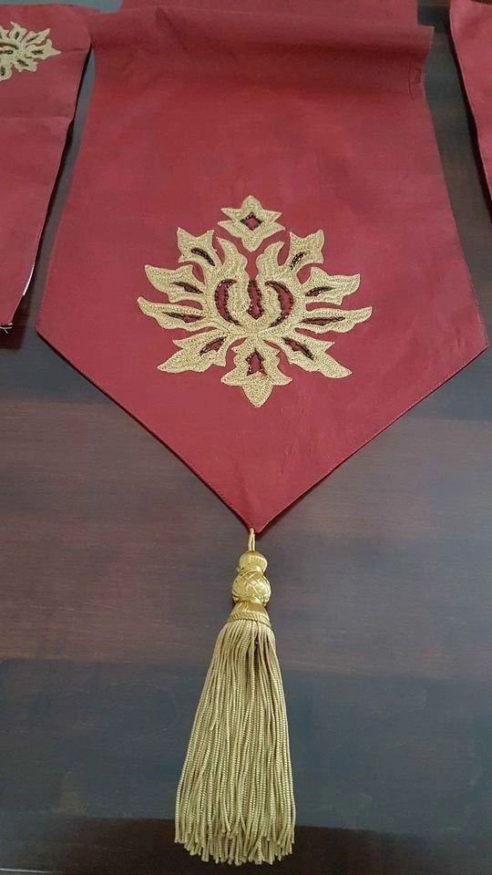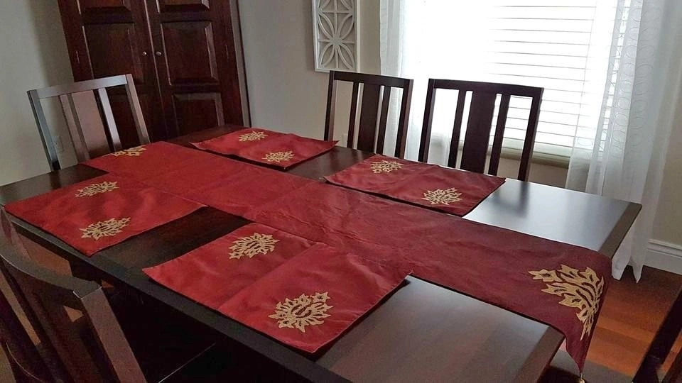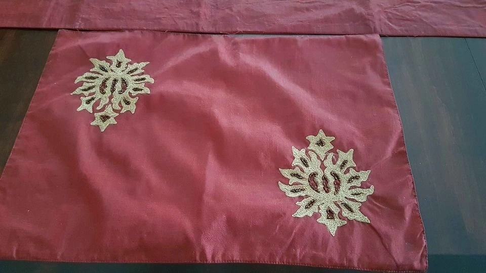 Elegant Dark Burgundy Matching Runner and Placemats. Lined Runner measures 13" wide and 82" long plus two removable tassels. Beautiful Antique Gold Embroidery and Burgundy Bead Detail. Four matching lined placemats measure 19" x 13". 100% Polyester. Only ever used as Decor. Smoke/pet free home. Pick up West end of Peterborough near Brealey. Five Piece Set - $10