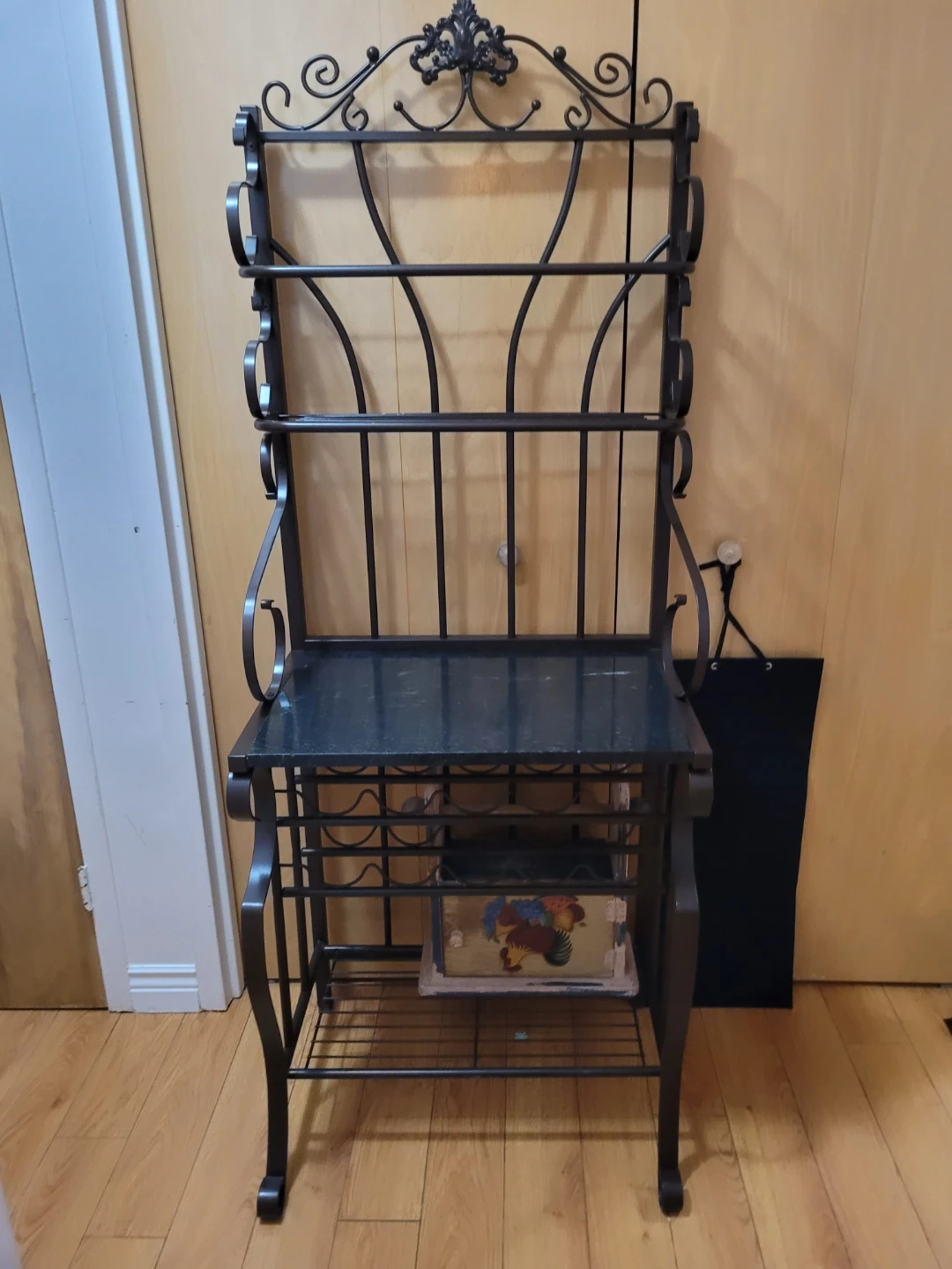 Selling a wrought iron baker's rack. It features a dark countertop and a space for wine bottles. It's in good condition and would be a great addition to any kitchen or dining area!