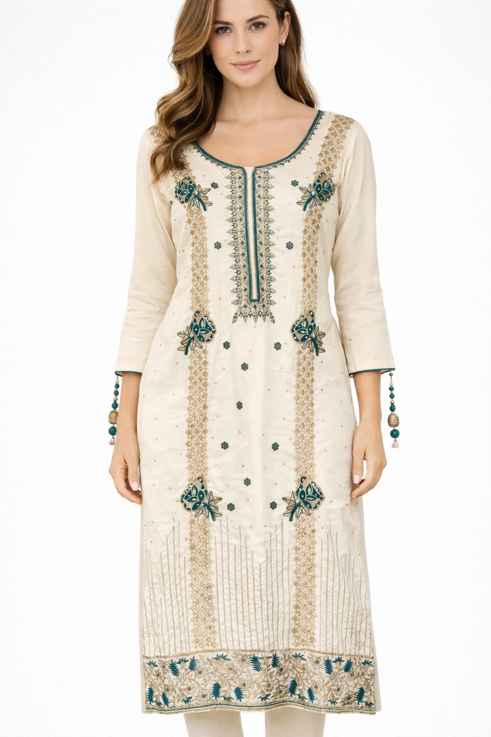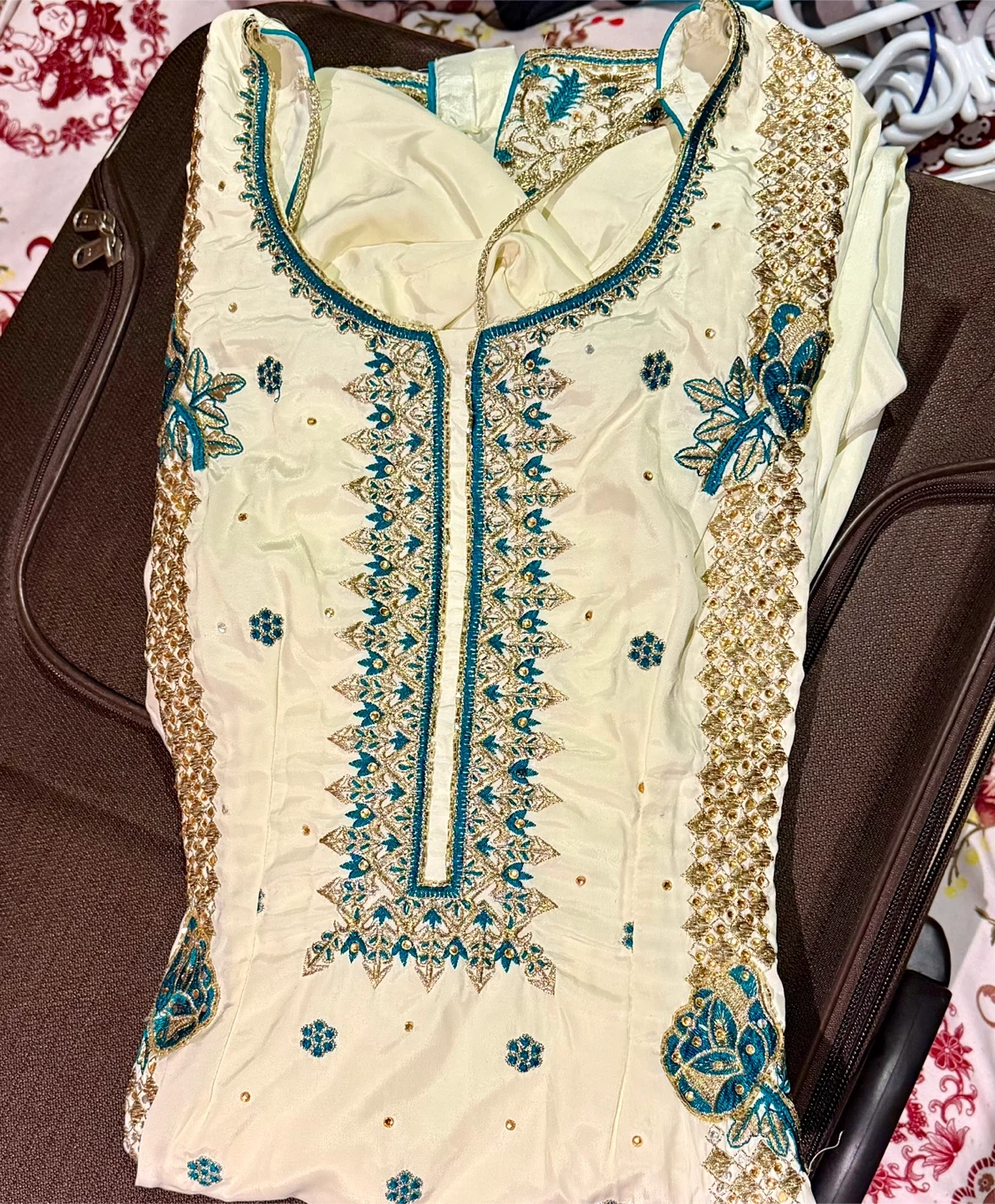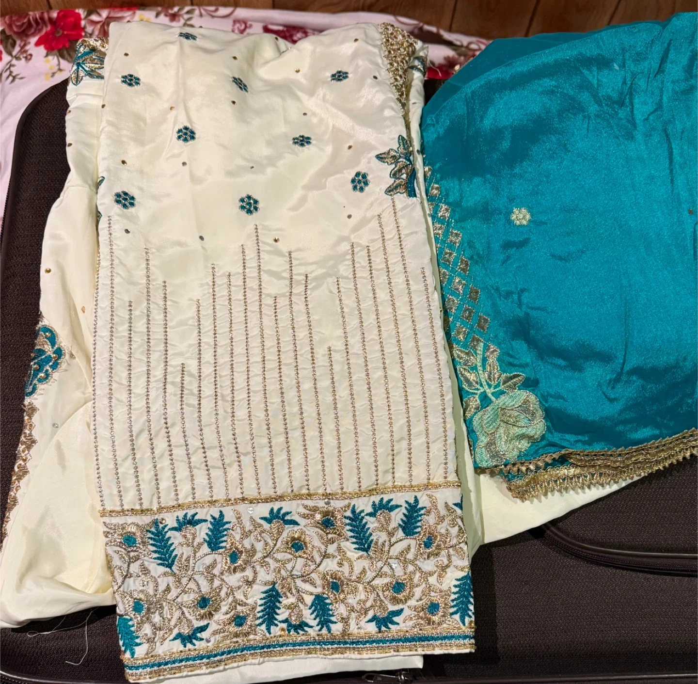Selling a beautiful salwar kameez! The cream-coloured top is intricately embroidered with teal and gold detailing. It comes with matching pants and a teal dupatta. Perfect for a special occasion or just adding some colour to your wardrobe.