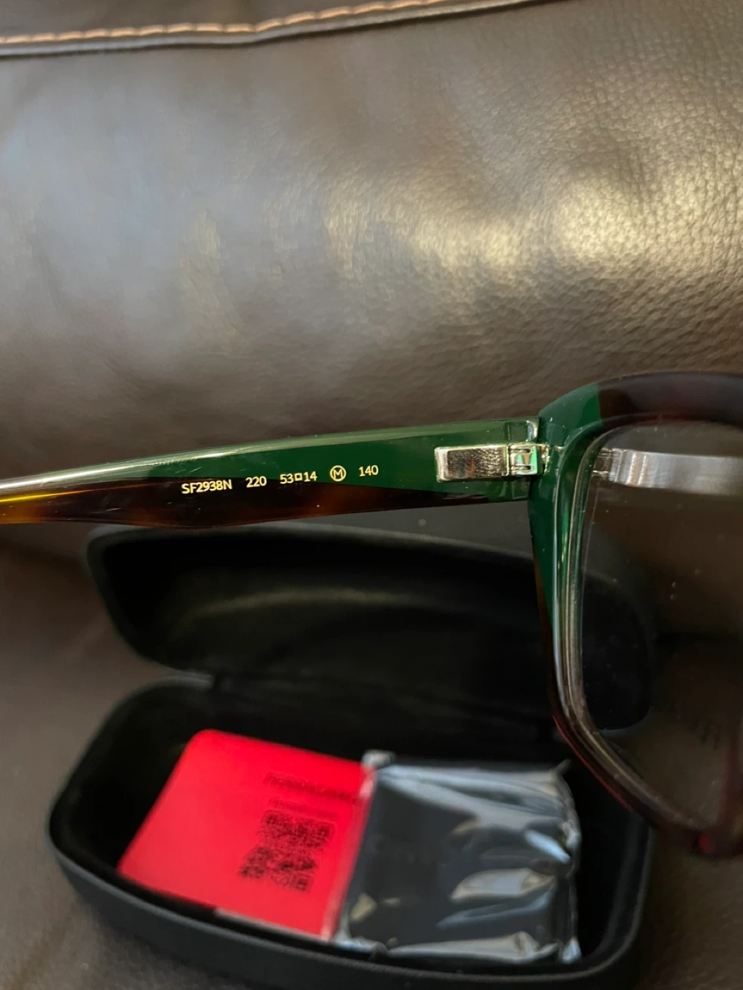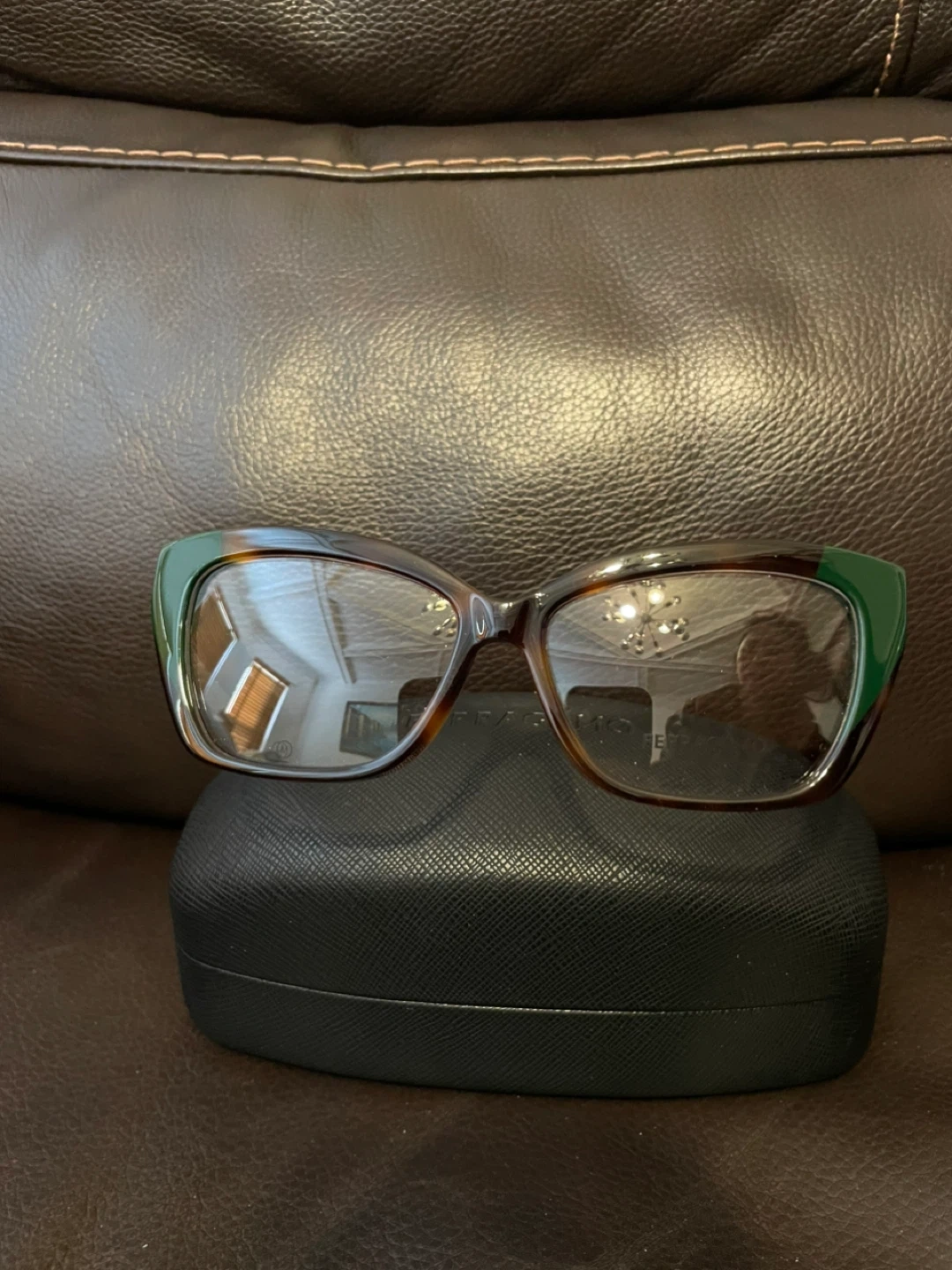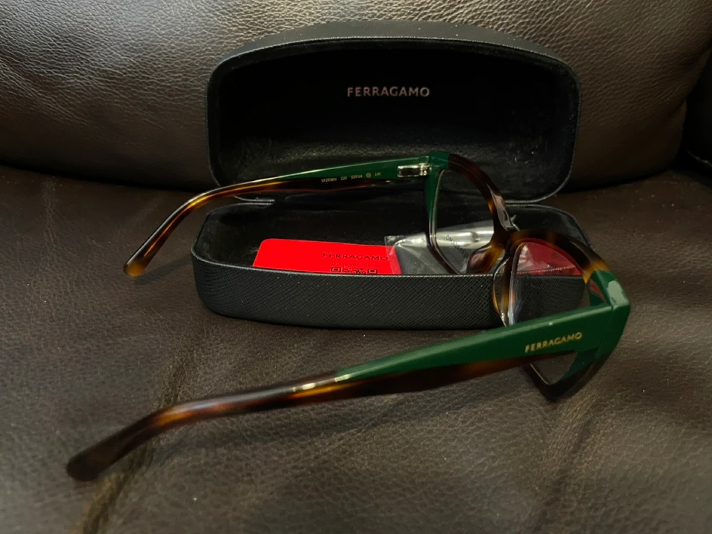 Selling a pair of Ferragamo eyeglasses in a stylish green and tortoise color combination. The model number is SF2938N, size 53-14 140. They come with the original Ferragamo case.