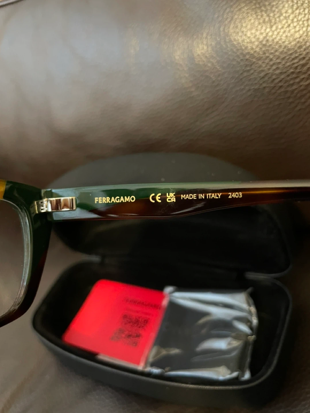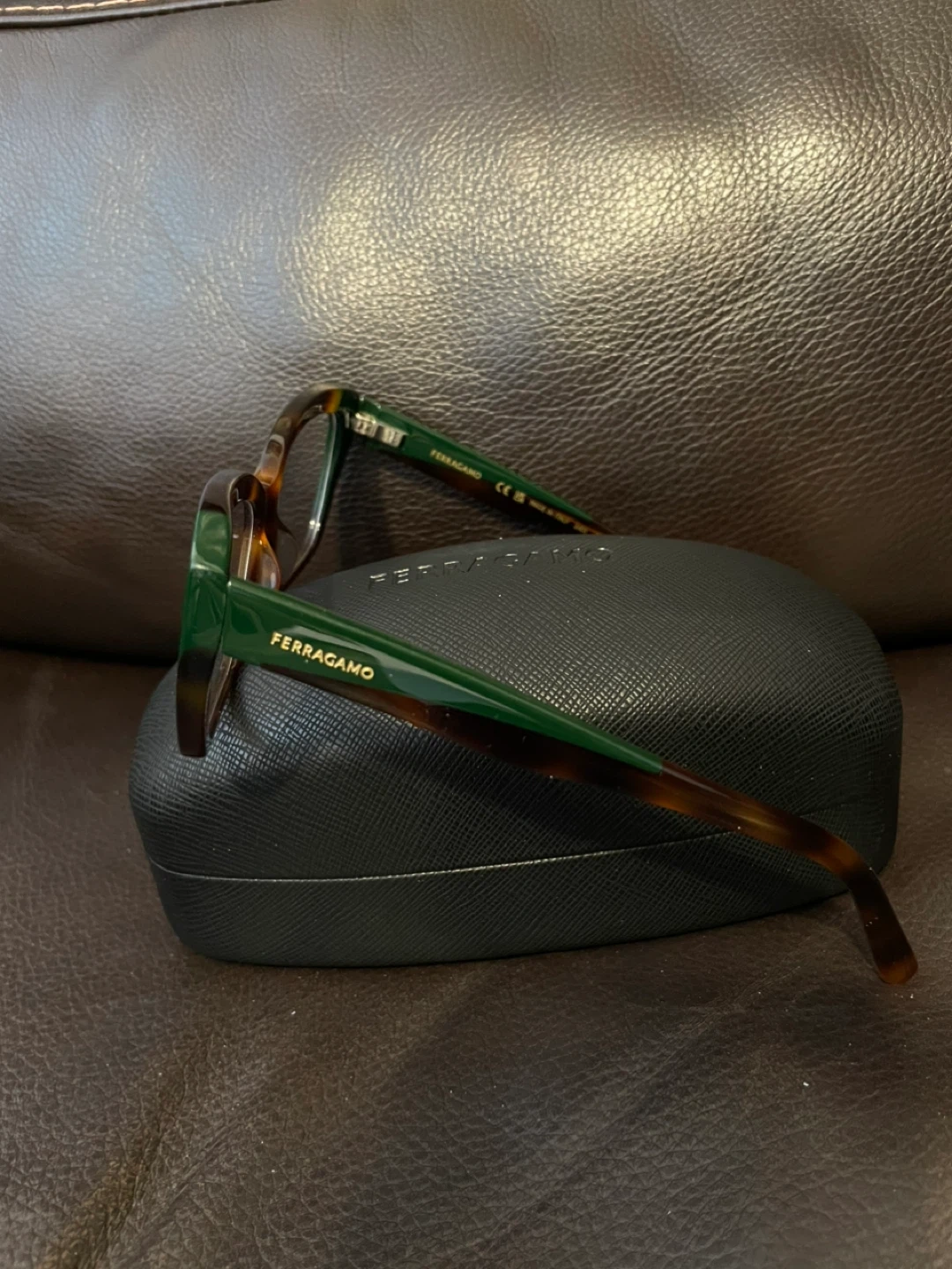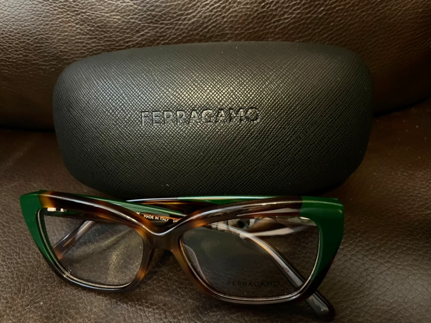 Selling a pair of Ferragamo eyeglasses in a stylish green and tortoise color combination. The model number is SF2938N, size 53-14 140. They come with the original Ferragamo case.