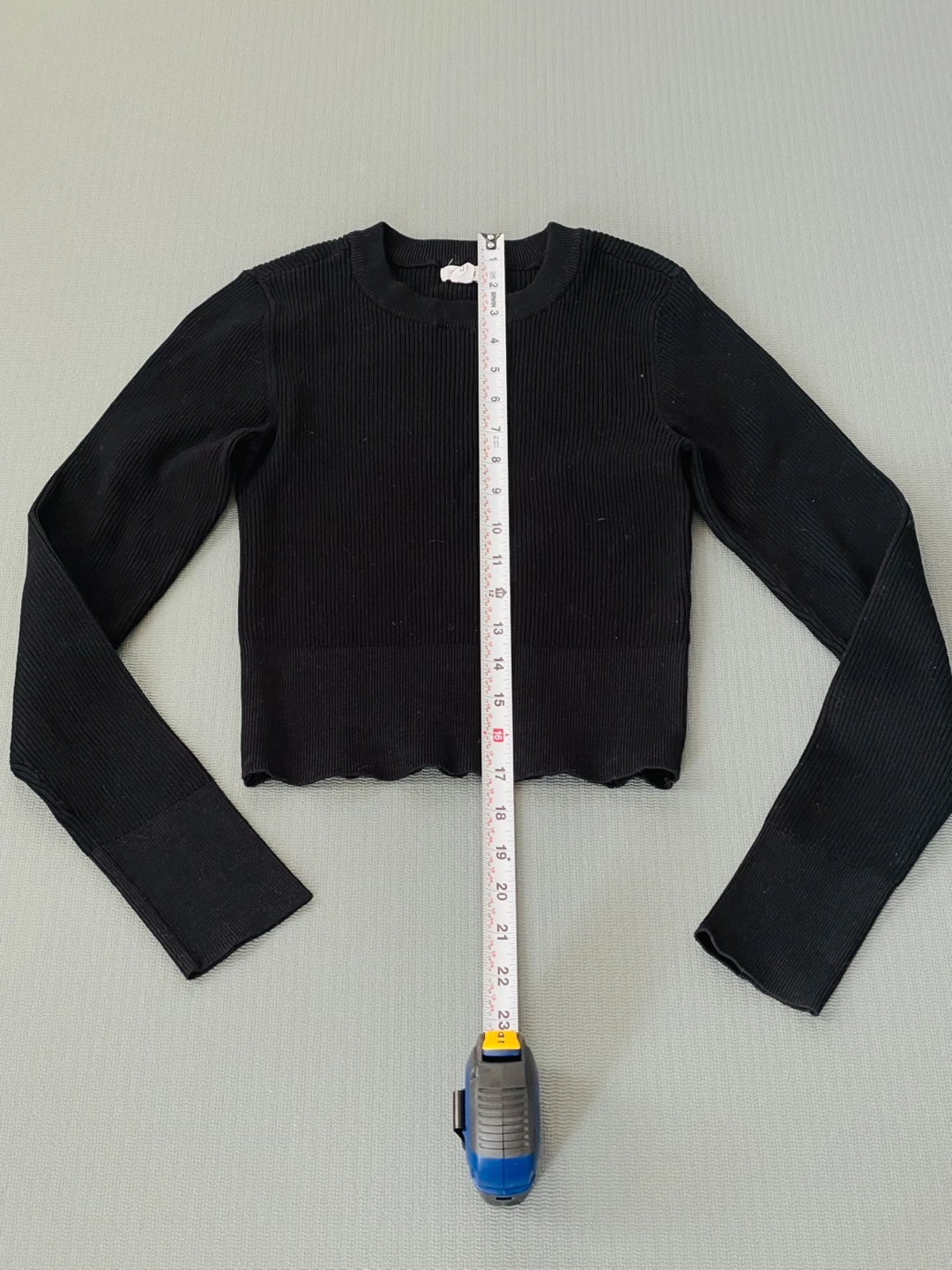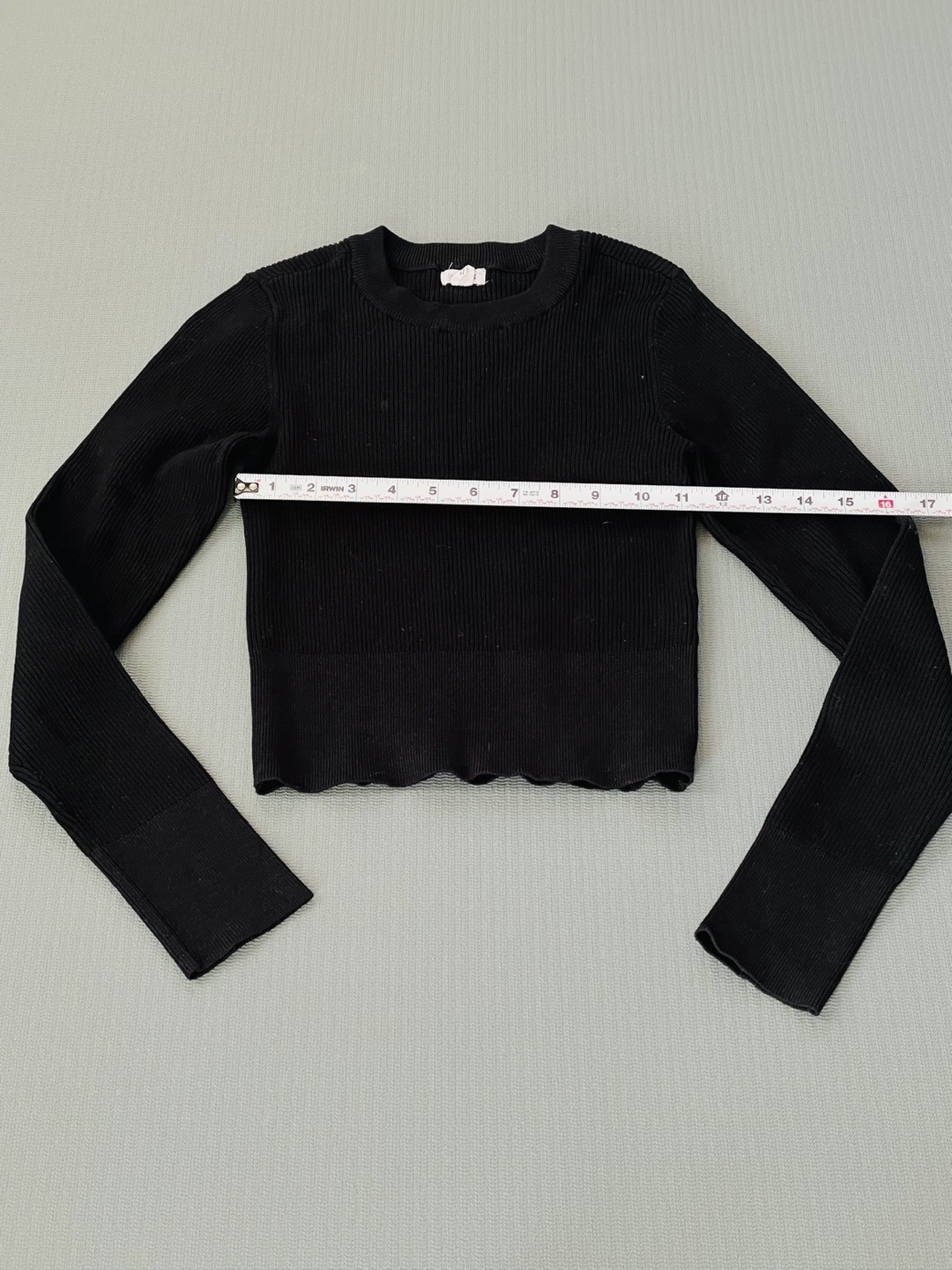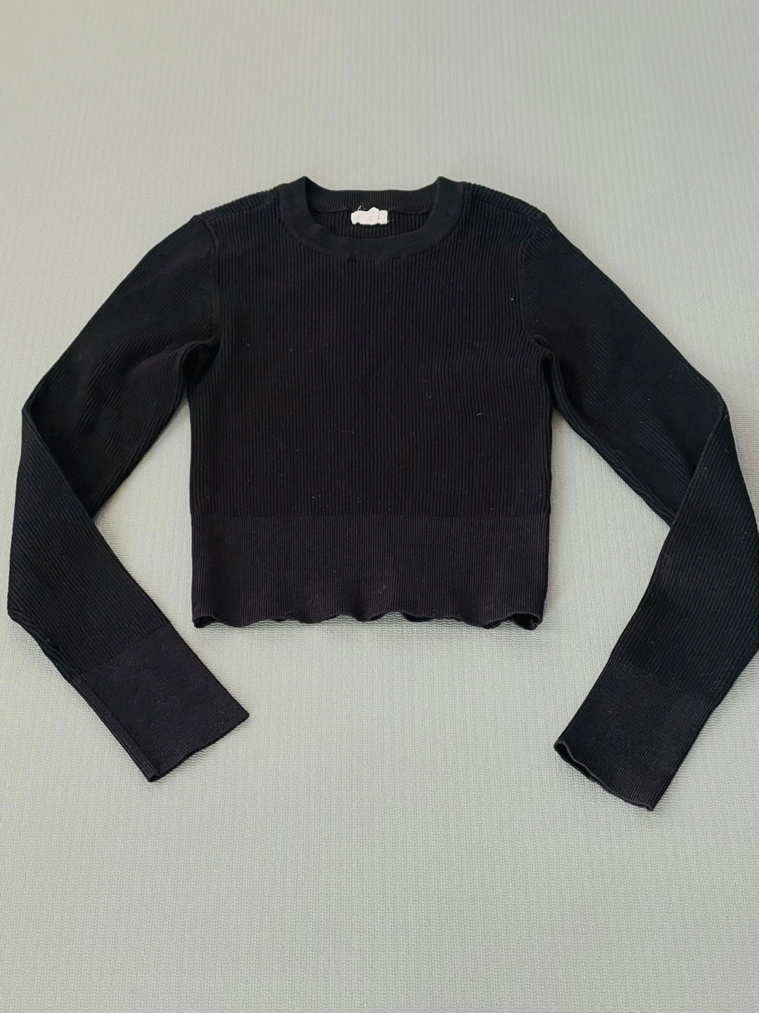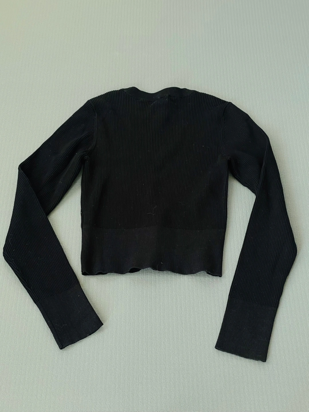 A simple black ribbed long sleeve top! It's in great condition and would make a great addition to any wardrobe. The material is soft and comfortable, perfect for layering or wearing on its own