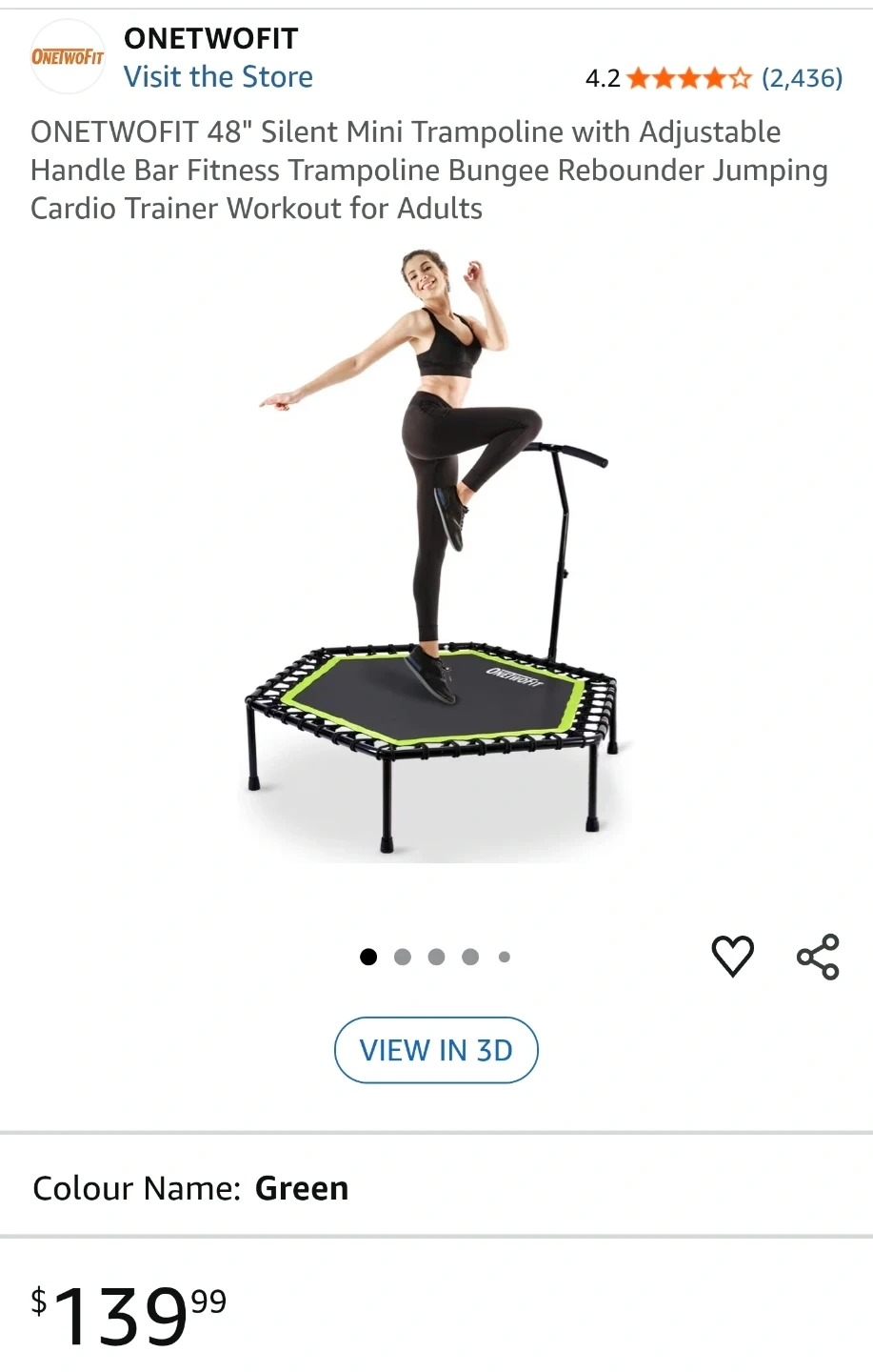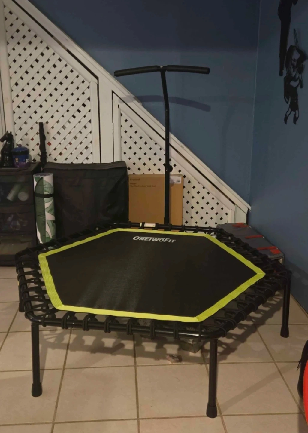 Selling a ONETWOFIT 48" silent mini trampoline in green! It comes with an adjustable handle bar, perfect for fitness trampoline, bungee rebounder, jumping cardio trainer workouts for adults. Originally bought for $139.99