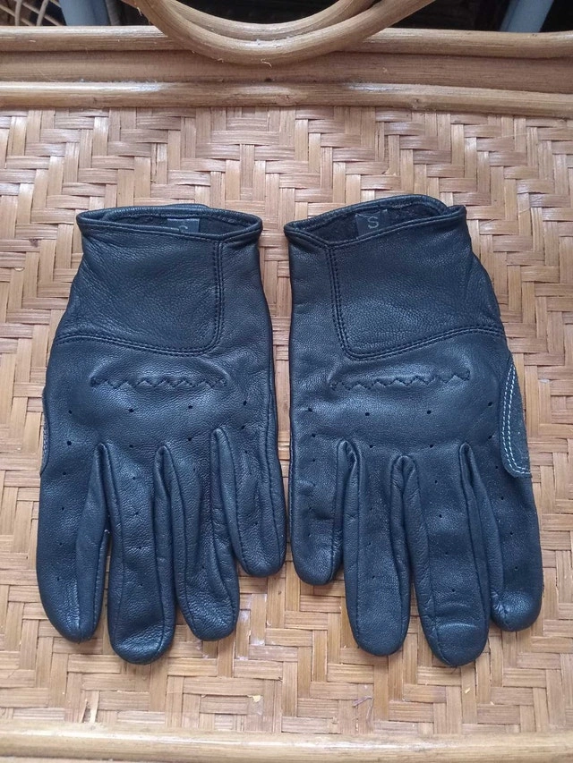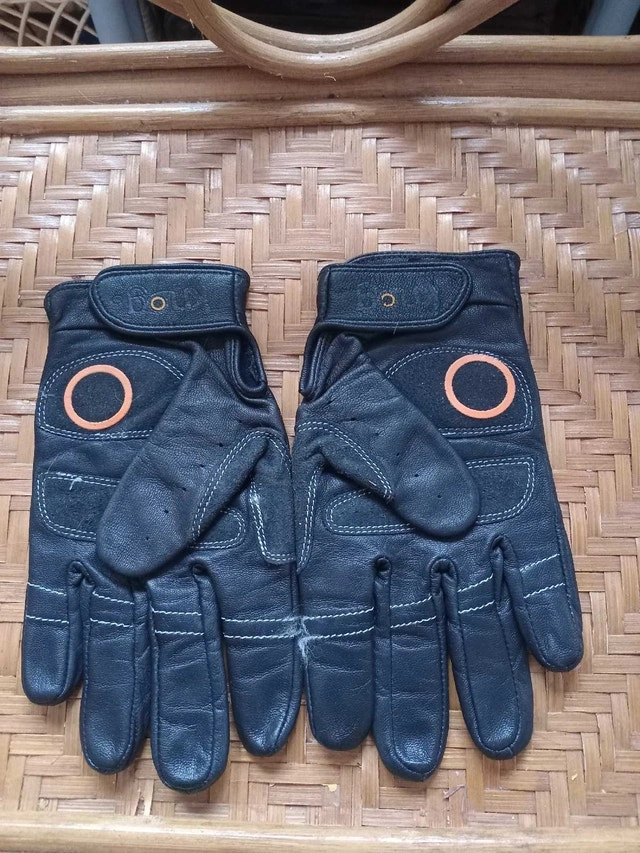 Size small. These stylish black motorcycle gloves feature leather construction with a distinctive orange accent on the back, offering both protection and flair while riding. Looking to rev up your style? Grab these gloves before they ride off into the sunset! And remember, if the ad is still up, the gloves are ready to go!