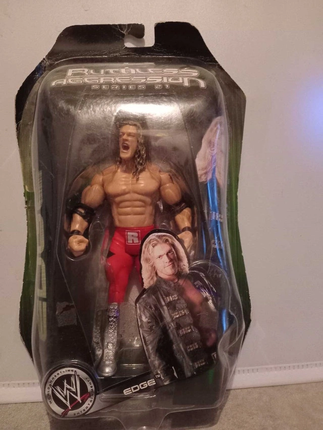 Get ready to rumble with this new in package WWE Ruthless Aggression Series 31 Edge action figure, a must-have for wrestling fans and collectors alike! This figure captures Edge in his iconic ring gear, ready to deliver his signature moves. The figure is still sealed in its original packaging, ensuring its pristine condition. Specifications: * Character: Edge * Series: Ruthless Aggression * Series Number: 31 * Condition: New in package Dust off your championship belts and make some room on your shelves, because this Edge figure is ready to bring the excitement of WWE right into your home. If the ad is up, the figure is still available, so grab it before someone else pins it down!