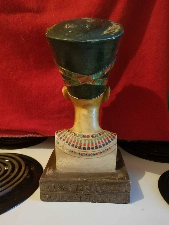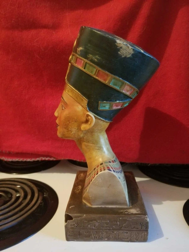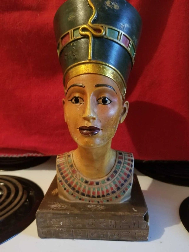 Add an air of ancient elegance to your space with this Horizons Int'l Ltd Nefertiti bust. This decorative piece captures the iconic likeness of the Egyptian queen, complete with hieroglyphics at the base, bringing a touch of history to any room. This is a used item, please see images for condition.