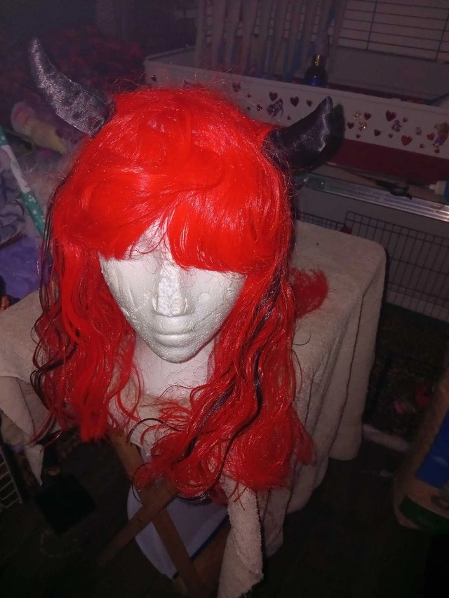 Ignite your inner mischief with this vibrant red devil horn wig! This unique wig features striking red synthetic hair with black streaks and devil horns, perfect for costumes, cosplay, or adding a fiery touch to any outfit. It's in good condition, ready to unleash your devilish charm!