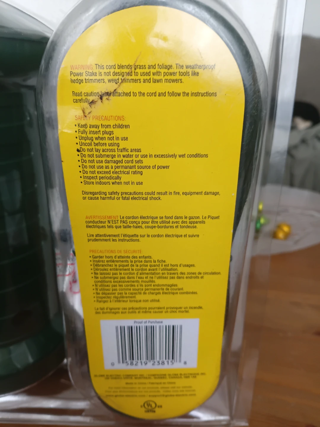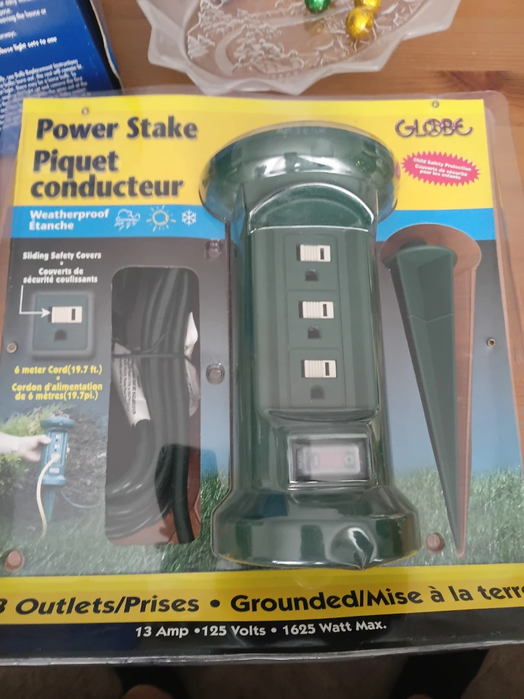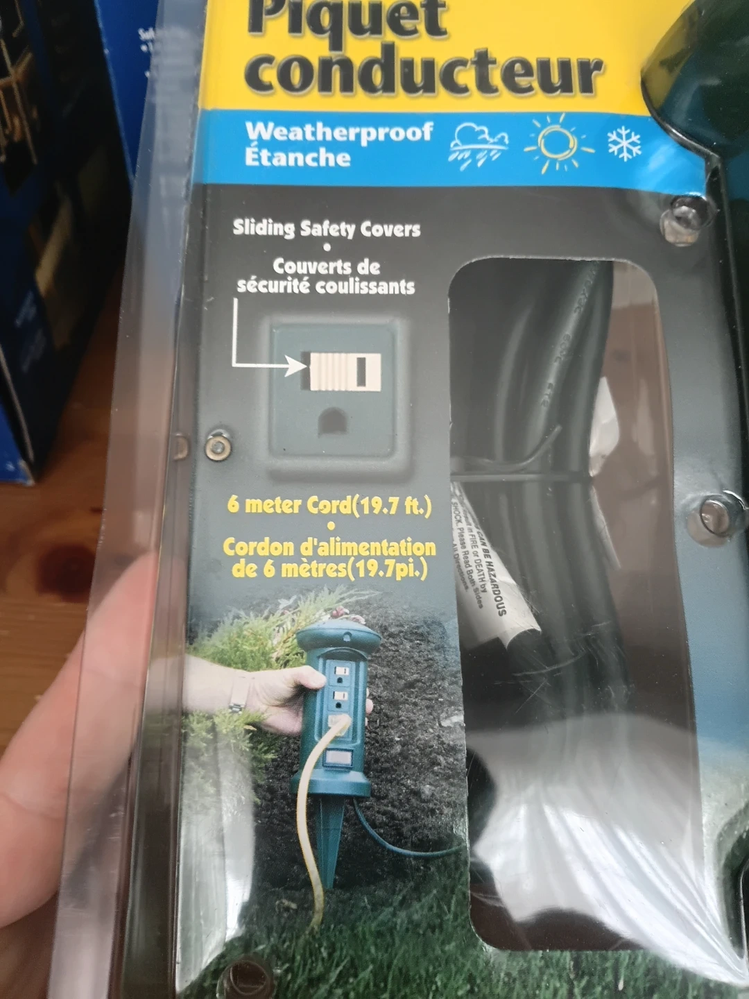 It's weatherproof and has sliding safety covers. The cord is 6 meters (19.7 ft).