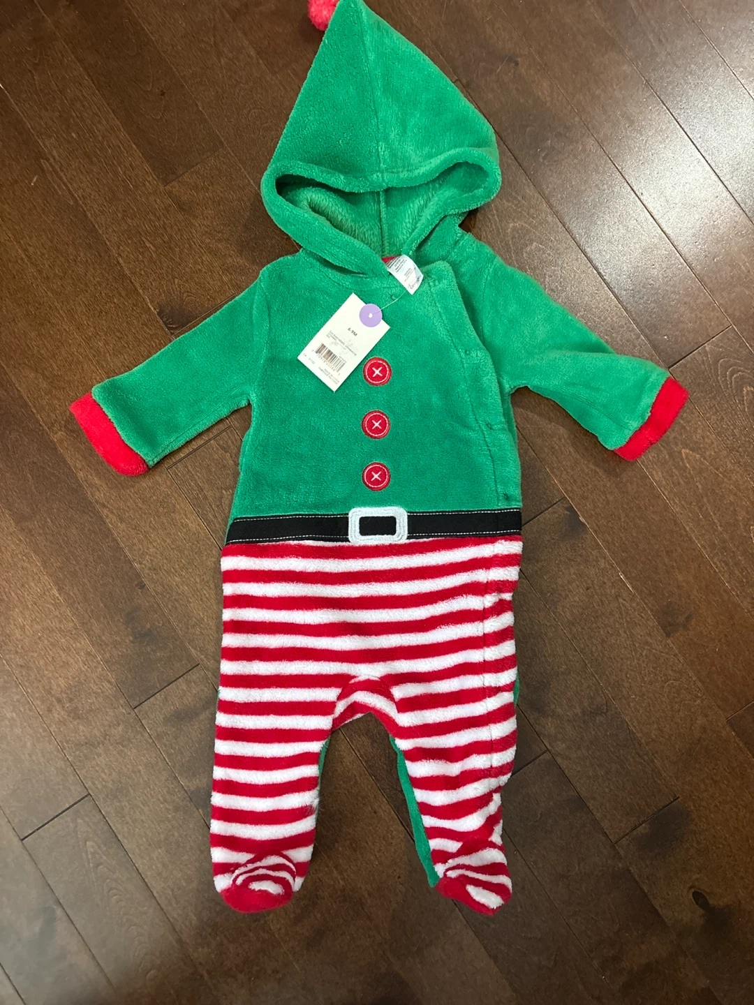 This adorable elf costume is perfect for your little one! It's brand new and sized for 0-3 months. The costume is green and red and has a cute little hood with a pompom!