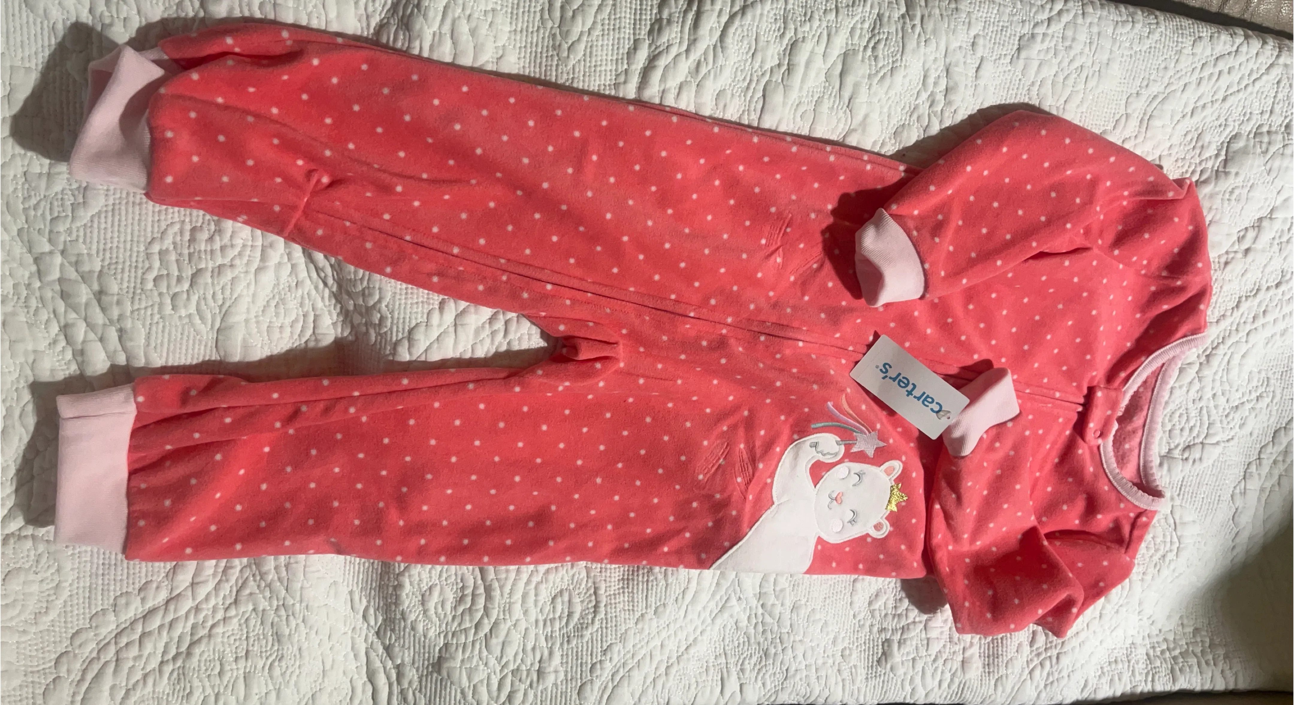 This is a brand new with tags Carter's coral fleece sleepsuit with white polka dots. It features a cute polar bear design. Perfect for keeping your little one warm and cozy!