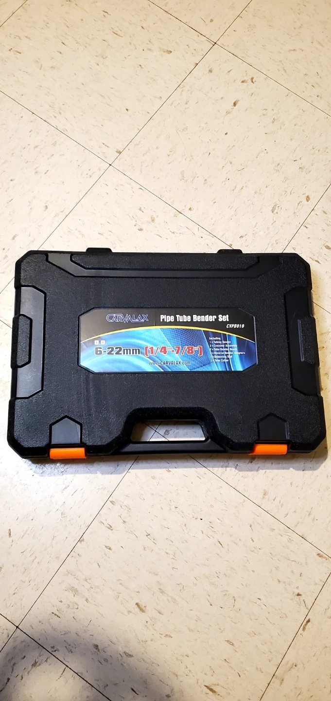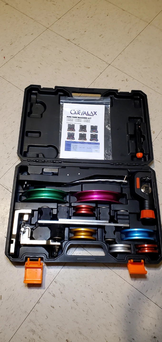 High-quality Carvalax pipe/tube bender set, perfect for HVAC, plumbing, automotive, metal fabrication, copper/aluminum tubing, and hydraulic line work. Comes complete with multiple aluminum bending dies, cutter, adapters, handle, and hard carrying case.