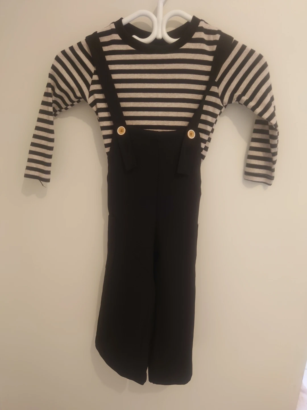 Cute kids' outfit featuring a striped long-sleeve top and black overalls. The overalls have button details. Perfect for a stylish and comfortable look for your little one!